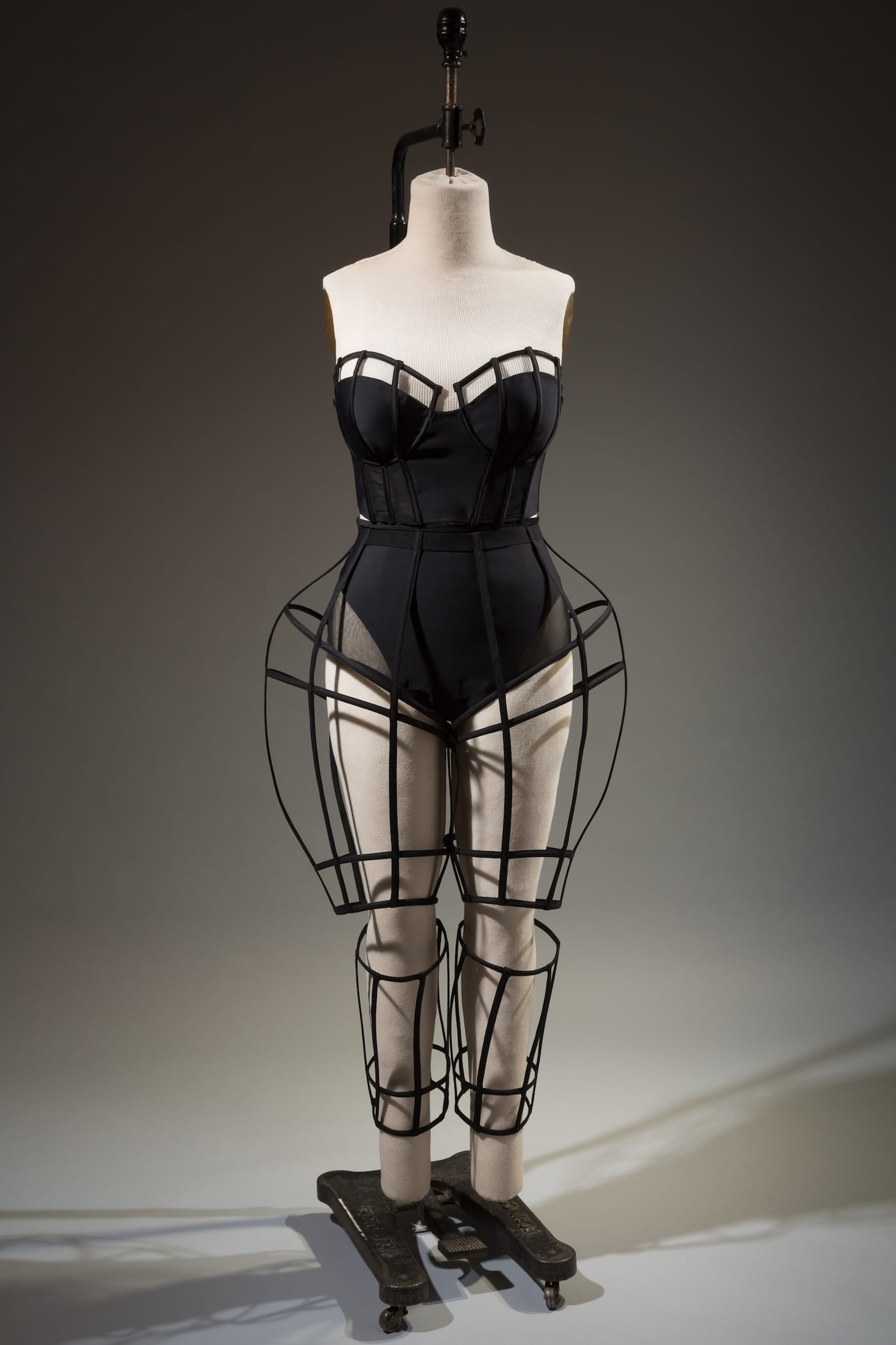 From 2010 onward, The Body stresses body positivity and inclusiveness, though this angle isn’t entirely convincing. While there are notable sections like wheelchair-friendly fashion, the new “ideal” seems to be Kim Kardashian and her “naked dress.” A one-piece bodysuit, designed by Becca McCharen’s label Chromat, features a plastic contraption whose outer structure references the boning of a corset; however, with wit and visual mastery, McCharen shaped the armor-like structure like a curvaceous lower body. While it clearly celebrates a more shapely figure than the one that has been in fashion until 10 years ago, it almost seems to imply that women might want to wear external corsets that will make them look like Kim Kardashian.