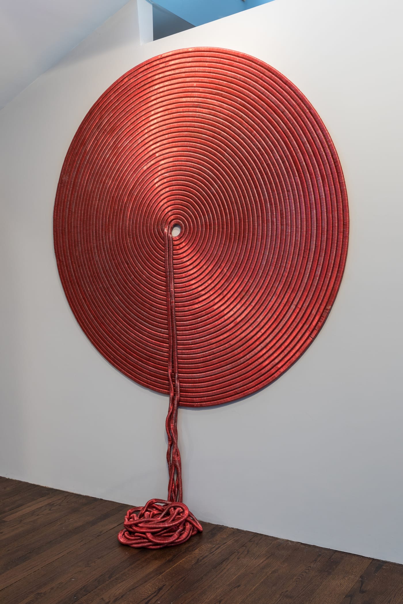 The scope of the exhibit is striking: the 20 artists featured contributed objects ranging from jewelry pieces to abstract sculptures, fashioned from materials like iron, steel, bronze, silver, gold, brass, and pewter. The vibrant minimalist work of Rana Begum, which is inspired by cityscapes, sits near Alice Hope’s coiled rope of soda can tabs, a piece that defies expectations for what metal as a material evokes. Caroline Rieckhof Brommer’s armor-like metal clothes and Katherine Vetne’s flattened casts of pitchers, as well as Holly Laws’ cage-like ironing board structures, introduce domesticity with a sharp, critical edge, while Carolina Sardi’s plated steel wall-mounted configurations are rich and minimalist.