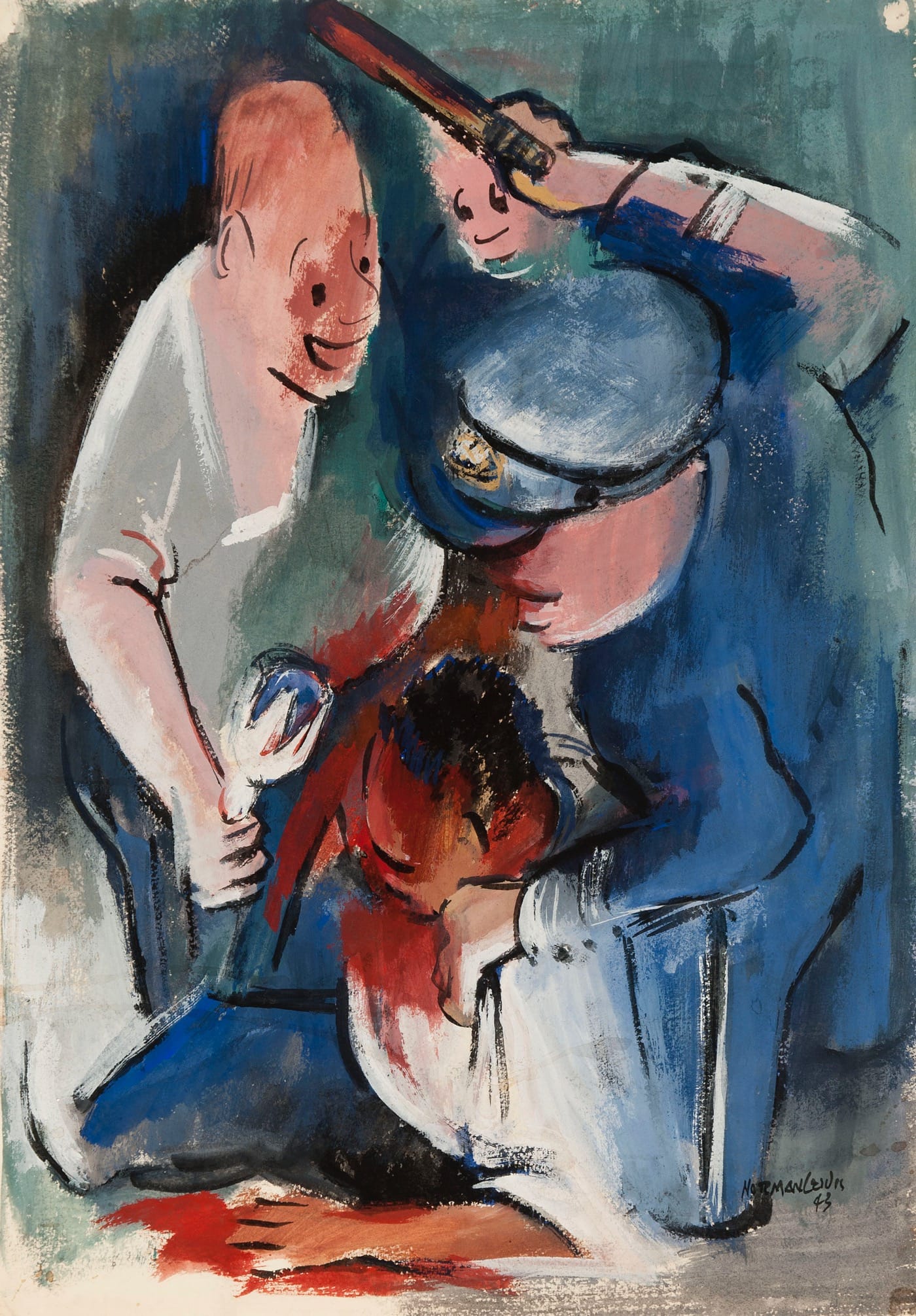 Modernism was by no means the only American aesthetic of the time, though it was the most potent as an international symbol of freedom. The exhibition collects some enlightening alternatives. Norman Lewis’ “Untitled (Police Beating)” from 1943 is a blurred depiction of a white policeman beating a black man in which abstract strokes connote movement, oppression, and a white onlooker’s glee. Lewis did not separate abstraction from social subjects, and his brushstrokes are not expressions of internal storms but of real violence. On the other hand there are Norman Rockwell’s scenes of prosperity in white America: realistically rendered images depicting abstract values such as “Freedom of Speech” or “Freedom from Want” (1943). Neither of these perspectives would fit into the FCC’s vision of cultural freedom: the first was too social and marginal, the second too small-town, too kitsch. Instead, the aesthetic of American freedom would be delivered in bold colors and broad gestures, through powerful, inscrutable individuals and formal innovation. Both this aesthetic and its chosen champions continue to inform current images of freedom. Parapolitics traces the history of freedom as an ideology with its own aesthetics: an ideology that prioritizes individual rights over communities, and can rationalize such American freedoms as the right to bear arms or limitless free speech.