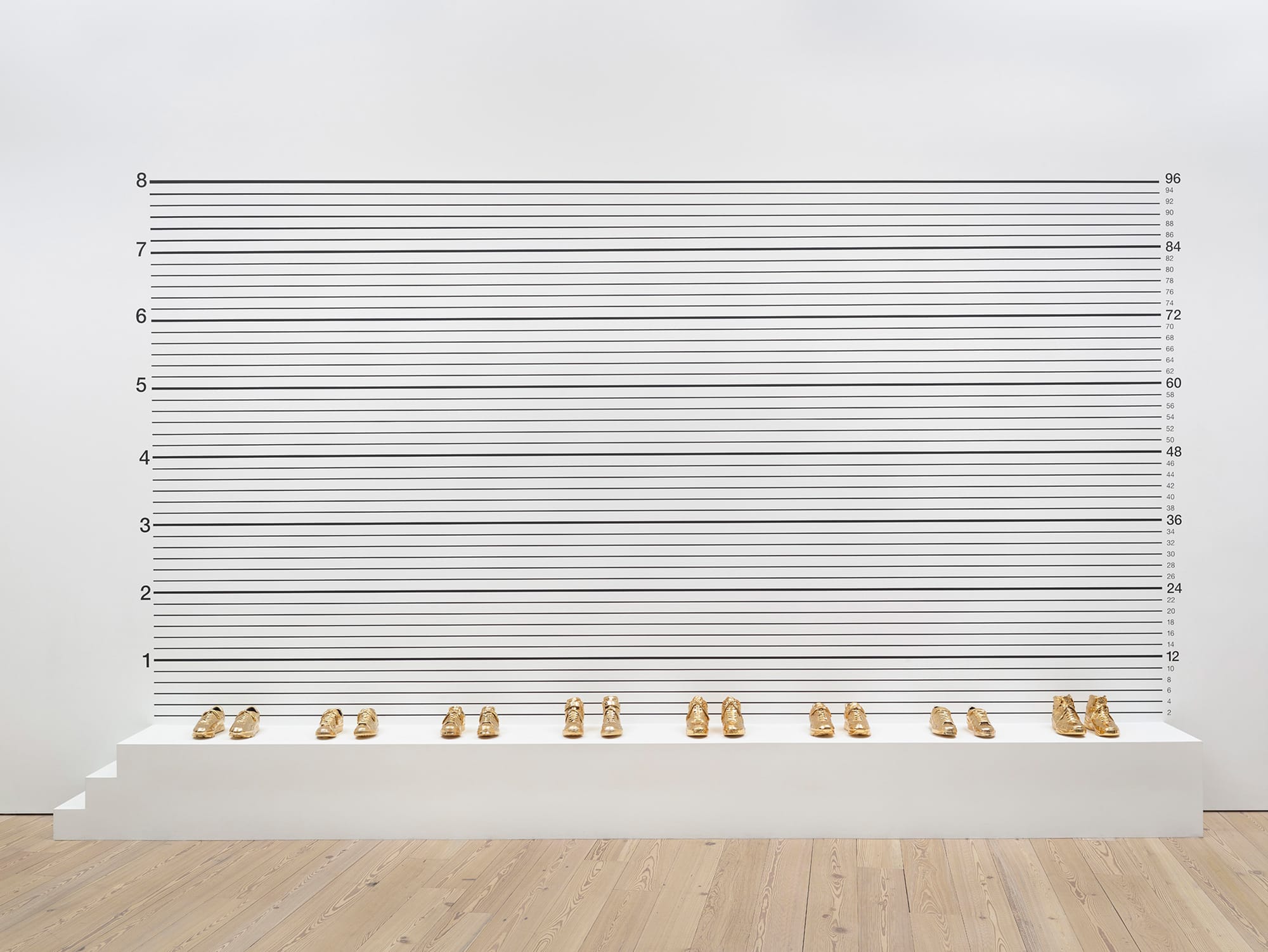 We can also feel this in-between approach in Simmons's signature erasure technique, in which he creates drawings, often of vintage cartoon characters, including the recurring use of the racial caricature of Bosko (created by Hugh Harman and Rudolf Ising in the 1920s), with chalk and/or paint that he pushes, smudges, and blurs across the surface of chalkboards, walls, and canvases. The physical process he employs obfuscates the image just enough to render it simultaneously visible and obscured, creating a specter of an image or the suggestion of the body when the body is not physically present. That specter of the body is exemplified in his work, “Lineup” (1993), which depicts the backdrop of a police lineup height chart, with a series of gold-plated basketball shoes in front of it, featuring brands like Adidas and Nike, gleaming in the gallery’s light. By removing the corporeality of the figure and referencing racial profiling used by the police, Simmons acknowledges the public’s own internalized and implicit biases and forces the viewer into a confrontation with them.