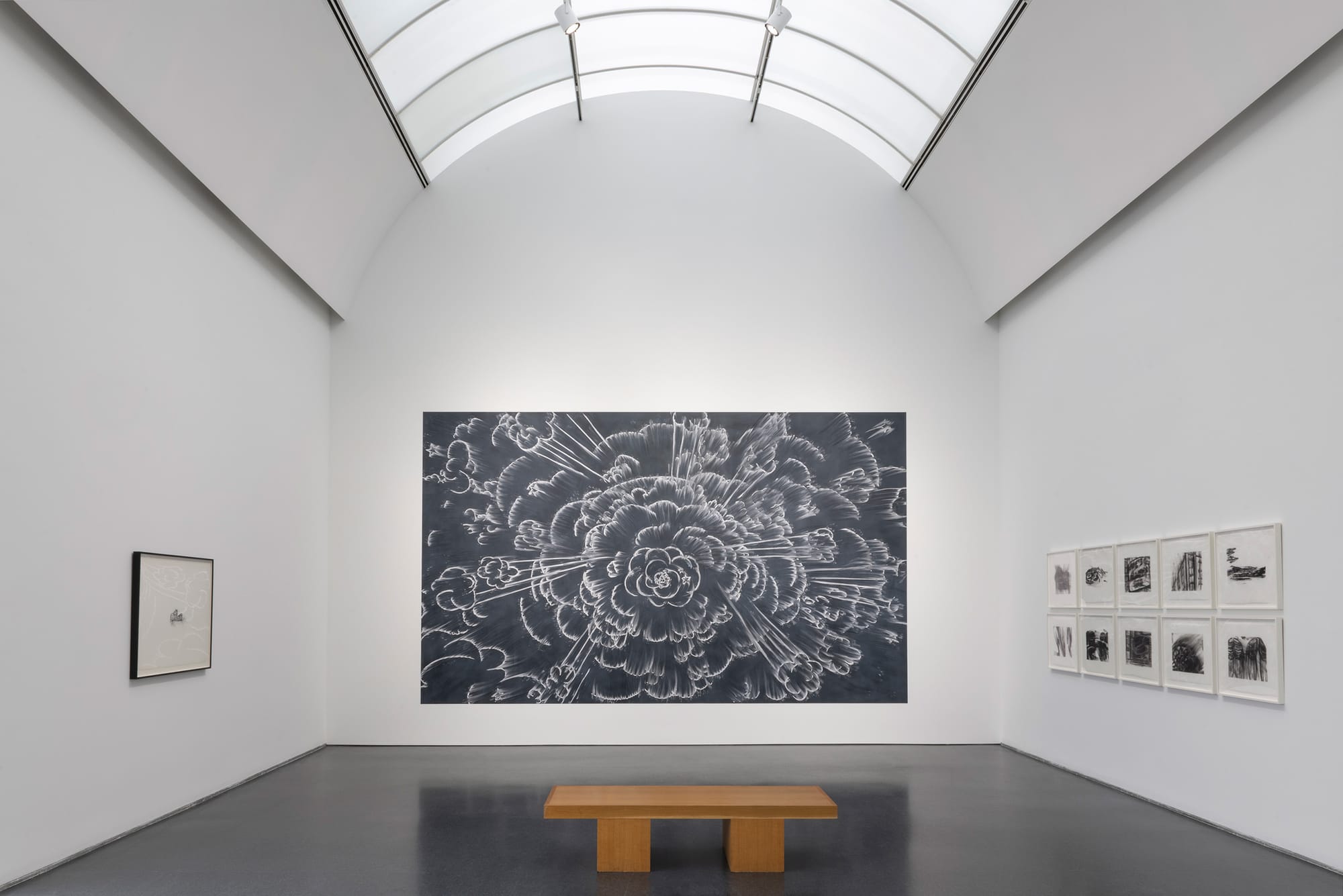 Simmons's work possesses a sense of in-betweenness, which, according to the artist, is exactly where he wants the viewer to be. “Not to try to create a sound bite, but I think that all the good shit happens in between those spaces. It is the stuff that happens in between the cracks, there is something concrete about being in one place or the other. The interesting thing," he added, "is where it is murky or not so clear, it forces you to use your creativity and your critical voice to fill in the holes and the gaps and make those lines clear.” This in-betweenness is seen in various ways throughout Simmons’s oeuvre and is well represented in his MCA Chicago show, curated by René Morales and Jadine Collingwood, with Jack Schneider. Take for example the moments of implosion versus explosion, which are visible in “boom” (1996/2003), a site-specific recreation of a 1996 wall drawing that reads like a cartoon explosion emanating from the gallery wall. This work, and many of Simmons’s other wall drawings, are ghostly with the velvety texture of the chalk applied to the painted surface; they border on the hypnotic. Beneath that sumptuous visual experience is a sharply pointed institutional critique. This act of mark-making upon the structure of the museum becomes paradoxically permanent within its impermanence. Yes, it can be painted over and disappeared, yet it cannot be removed — it becomes permanently embedded within the membrane of the museum, forcing the institution to cede its absolute power and control over its contents. It is an act of artistic dissidence by infiltrating the museum and critiquing it from inside its very walls. When asked if that was his intent, Simmons said emphatically, “Absolutely it is.”