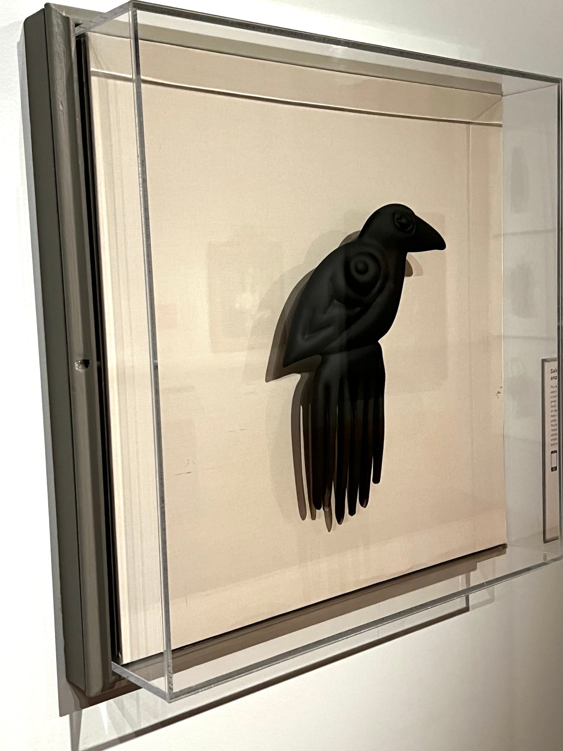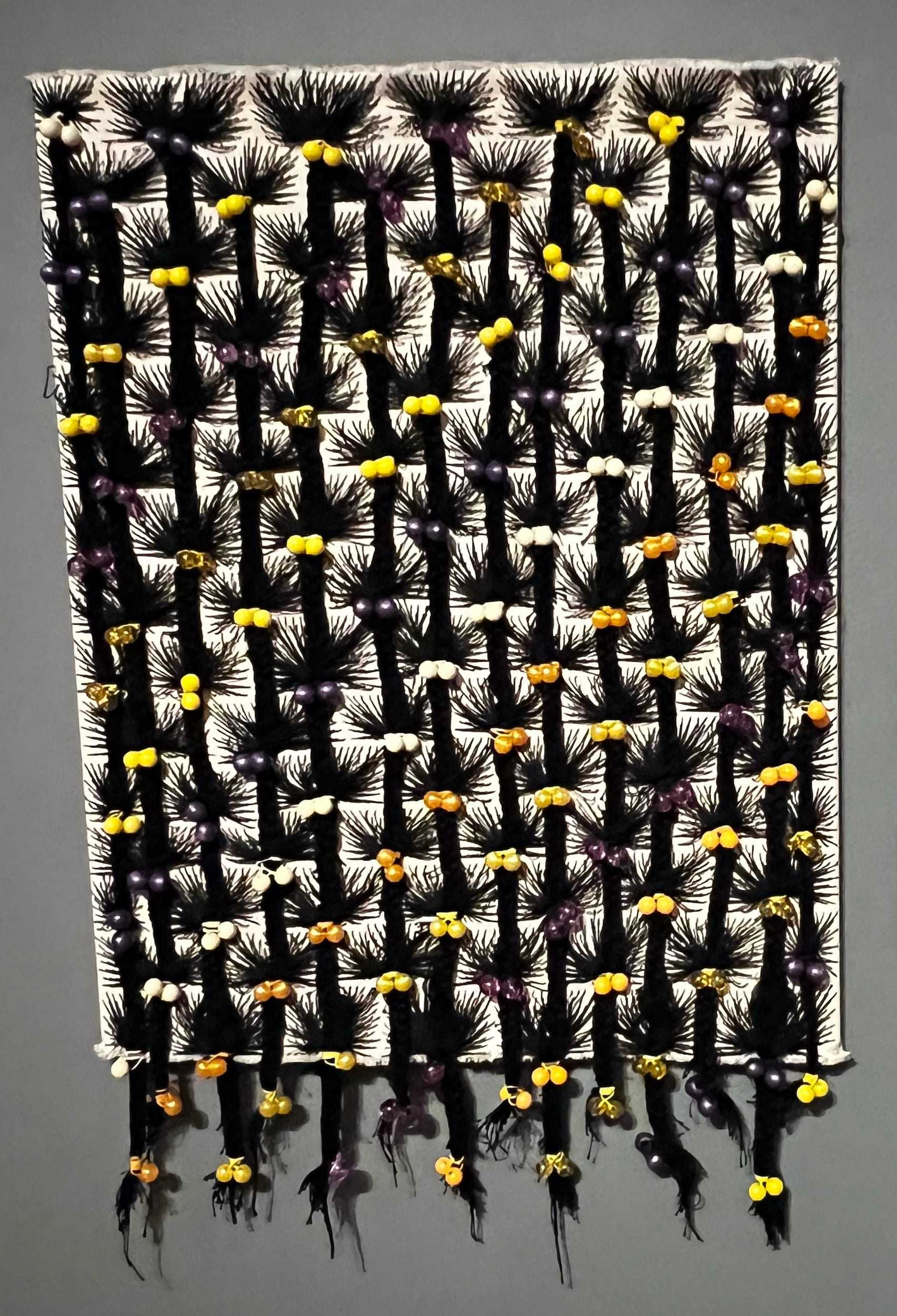 A recurring theme is the idea that something as universal yet culturally specific as hair tethers us to one another in unique ways. Sonya Clark’s “Bubble Gum and Double Dutch” (2020) evokes the nostalgia of being a little Black girl wearing braids and hair baubles. Displayed along with a hand-carved wooden afro pick belonging to Clark’s mother, there is a strong sense of Black diasporic kinship, memories, and lineages. A fascinating cross-cultural dialogue occurs between afro picks and the hair combs of Coast Salish communities, represented by Lummi artist Dan Friday’s glass “Raven Comb” (2018). The show emphasizes that the traditions that form hair histories are often passed down from elders and ancestors. These stories then influence how we style and take care of our hair today.