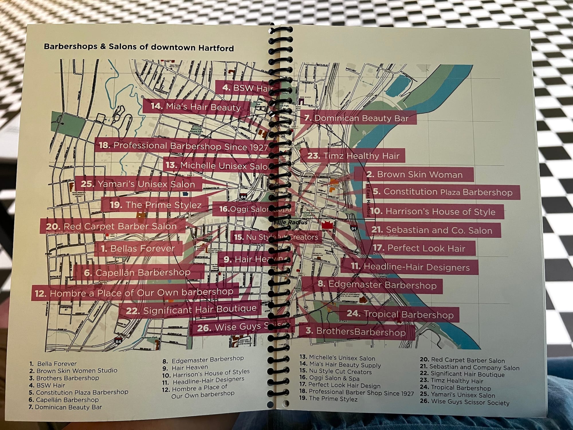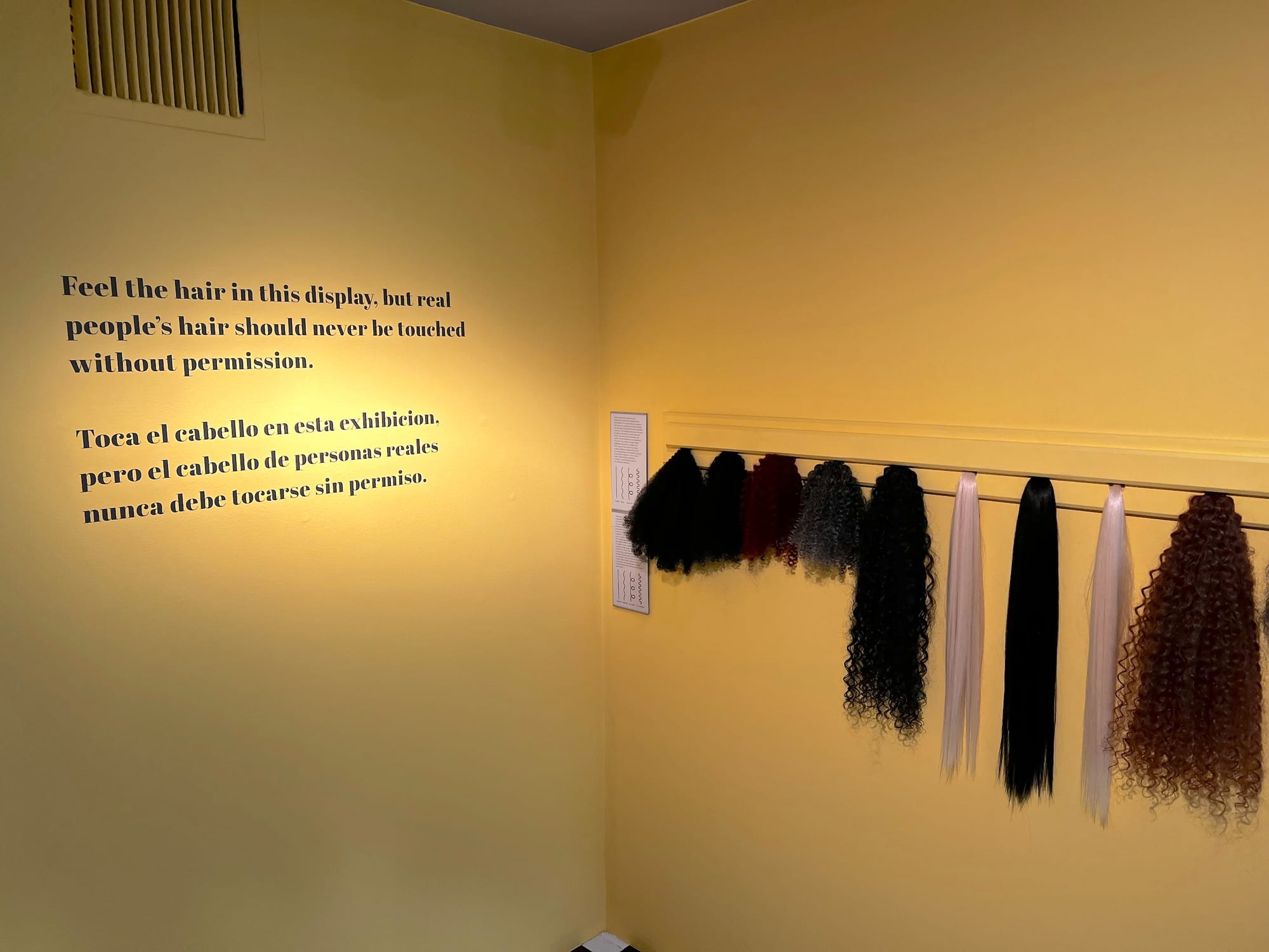 In fact, one of the Wadsworth’s galleries is designed to look like a barbershop, complete with a black and white checkered floor, a sign exclaiming “Walk-Ins Welcome” on one of the bright yellow walls, and a barber chair in which you can sit to snap a selfie in the mirror. An interactive display of hair on the wall invites visitors to touch the differently textured locks, though text on the adjacent wall serves as a reminder that we can feel the hair on display, but it is not okay to touch someone’s hair without permission in real life. We learn from other didactics that the CROWN Act (Creating a Respectful and Open World for Natural Hair) is a law in Connecticut and 22 other states. The law protects Black people from the race-based hair discrimination that has all too often policed the hairstyles that can be worn at school and in the workplace. Nearby, museum-goers are prompted to “share your hair story” on a wall of notecards displaying stories and self-portrait drawings. Wadsworth staff members and other folks from the community also share their hair stories, reproduced in a zine that was designed in conjunction with the exhibition; the stories take the form of poems, artworks, and personal essays. A notably delightful page reveals a map of 26 barber shops and hair salons in downtown Hartford, some of which collaborated with the curatorial team.