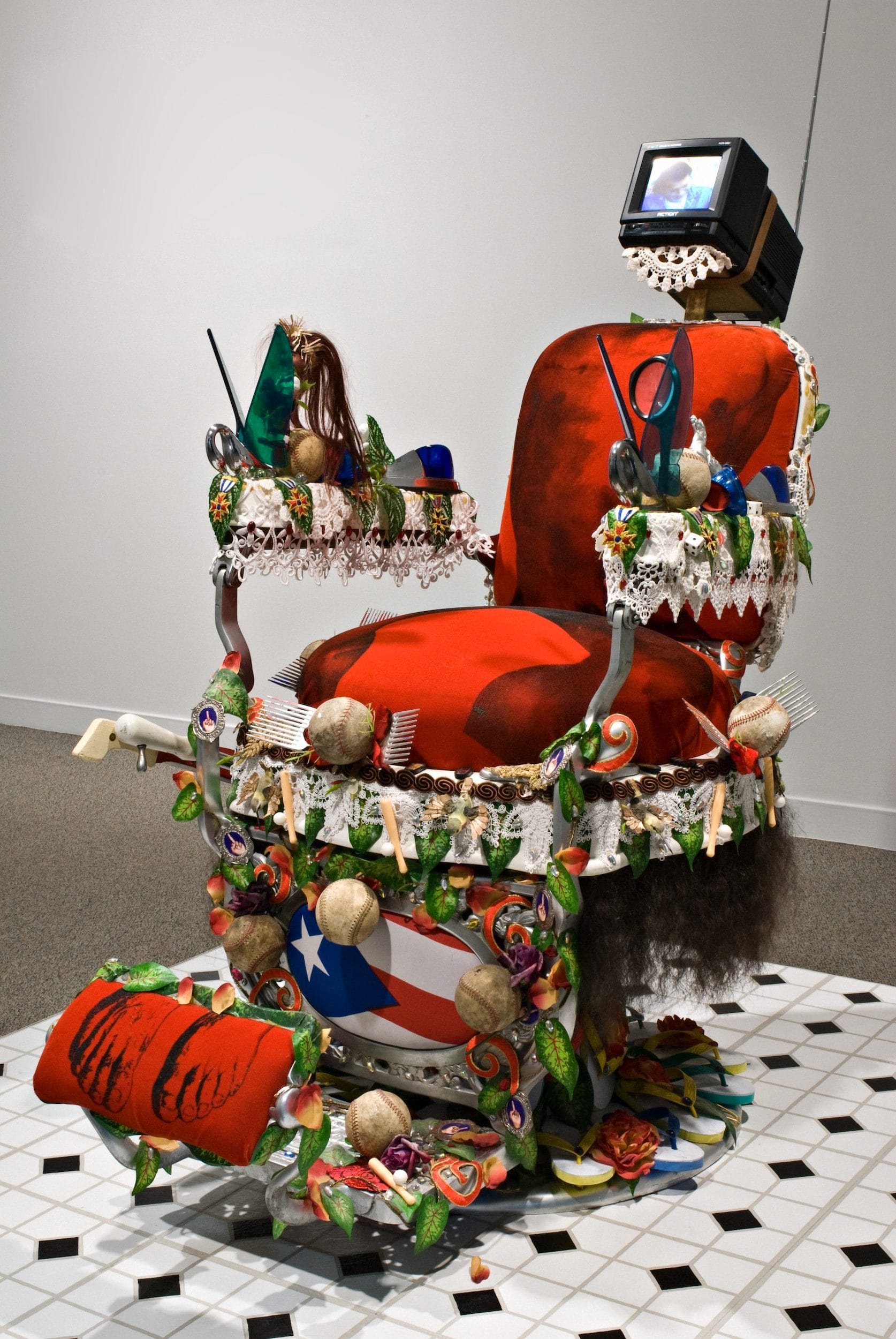 These individual reflections are a prelude for the other local and global hair stories that unfold, ranging from the turbans worn by Sikh men to the societal pressure on Black women to straighten their hair. Puerto Rican artist Pepón Osorio’s mixed-media sculptural installation “En la barbería, no se llora” (No crying allowed in the barbershop) (1994) is a powerful meditation on race, masculinity, and belonging in barbershops. Originally shown in a Puerto Rican neighborhood in Hartford, the work comprises a barber chair transformed into an altar decorated with baseballs, chanclas (flip flops), the Puerto Rican flag, and other ornamentation; it becomes a site of reflection on the artist’s first haircut and themes of machismo that emerge with the memory.