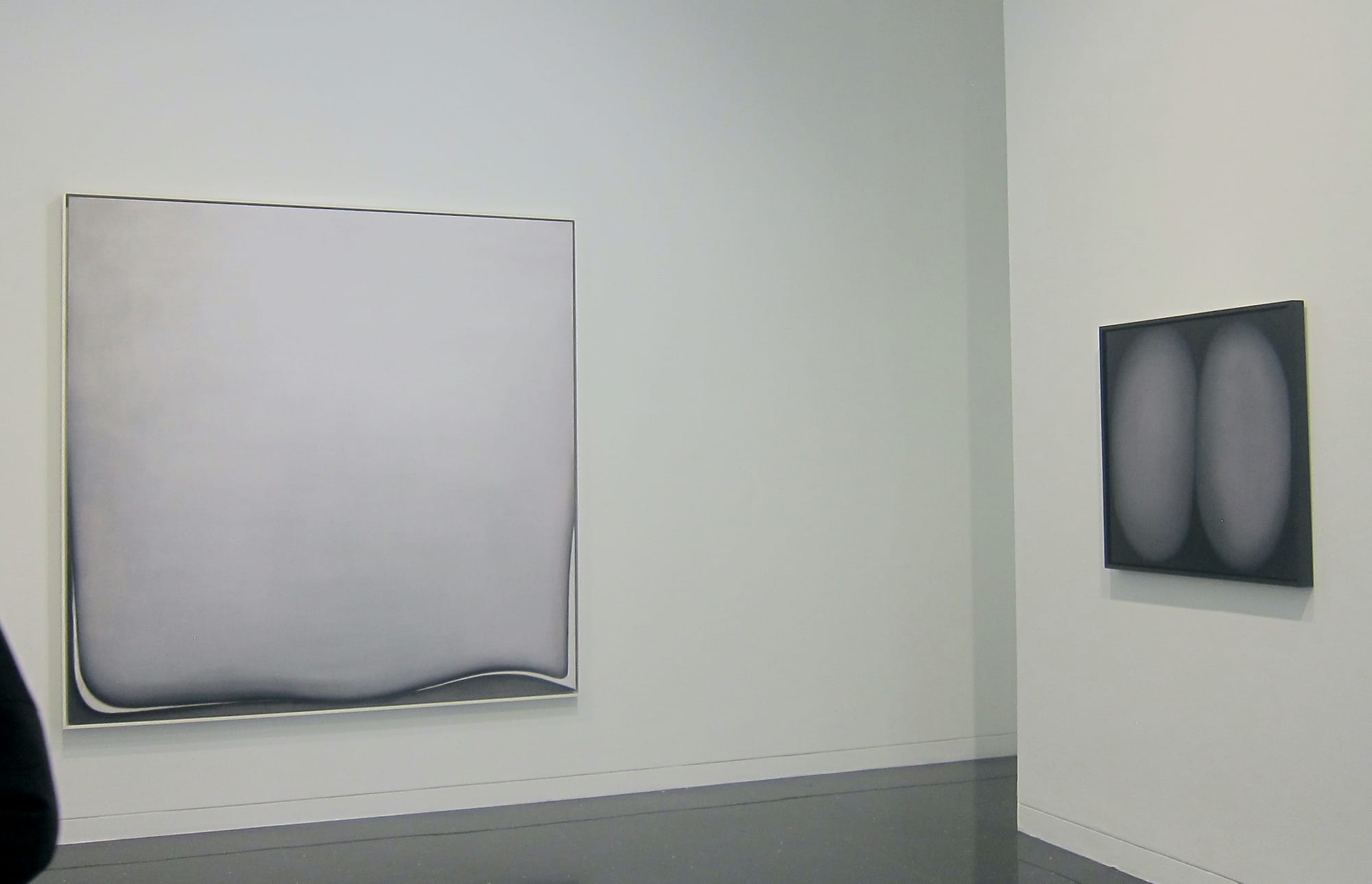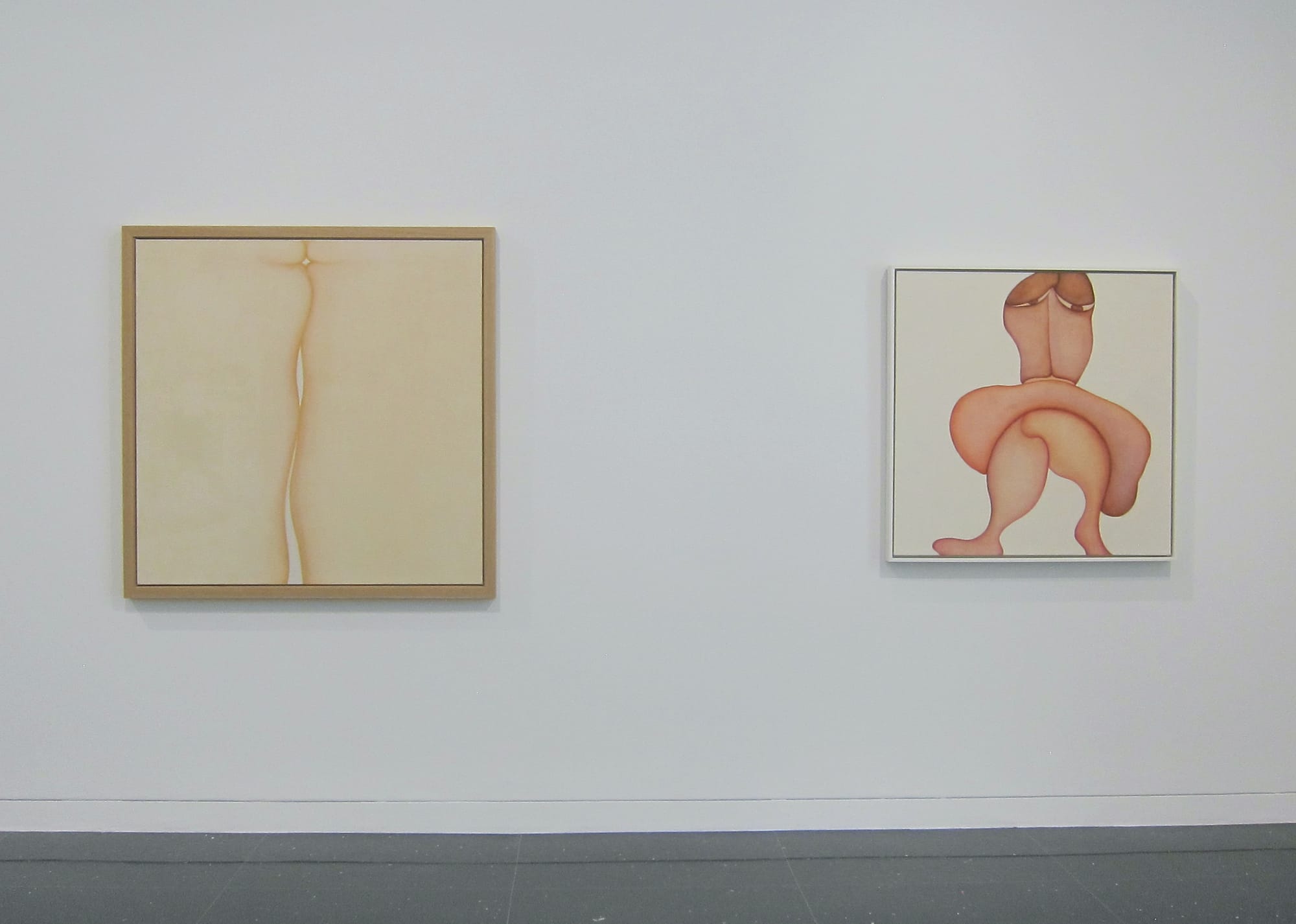 Bribes de corps means “body bits” in English, and it is an apt descriptor for most of the 27 canvases included here. Caland painted them between 1968 and 1980, and they are exuberant, amusing, poppish, and sexy. But it’s a silly, clever eroticism, like two large, rosy color field paintings that take a while to reveal that they are also fleshy buttocks sitting on the canvases’ edges, or a small tondo with mysterious black, white, and red shapes that could be a penis meeting a vulva. Several paintings play with the limits of facial and gender recognition, as features resolve from the geometric to the genital to the physiognomic. Or don’t: in any other context, some of these pictures would be plain abstraction, but here two lime blobs on a lemon ground very nearly touch and the effect is electric, like knees grazing under a table. An angular, creamy composition conjures the curve of a torso with a raised arm or maybe a pert breast. A huge white canvas is bordered by a set of quivering, hot pink lines, telling a body-positive joke on hard-edge abstraction and minimalism.