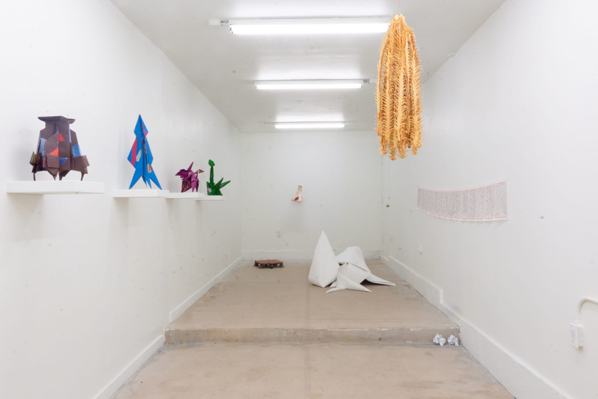 Hai-Wen Lin was just such a kid, and indeed all the larger works in Petal Fold are based on models they invented when they were younger. These got boxed up around the time Lin transitioned, and changed their name, and they’ve only recently been unpacked, during a residency at the Bemis Center in Omaha. The metaphoric potential, which Lin explores in a jewel of an artist text, astounds: Origami as an art of rearrangement, where new things can appear without the need for gluing or cutting, just by careful creasing and tucking, and getting one’s papers in order. Think about that for a moment in terms of the body and gender.