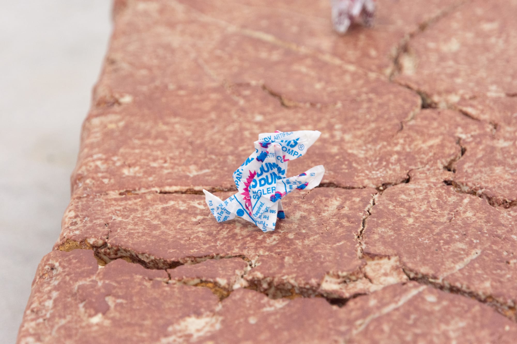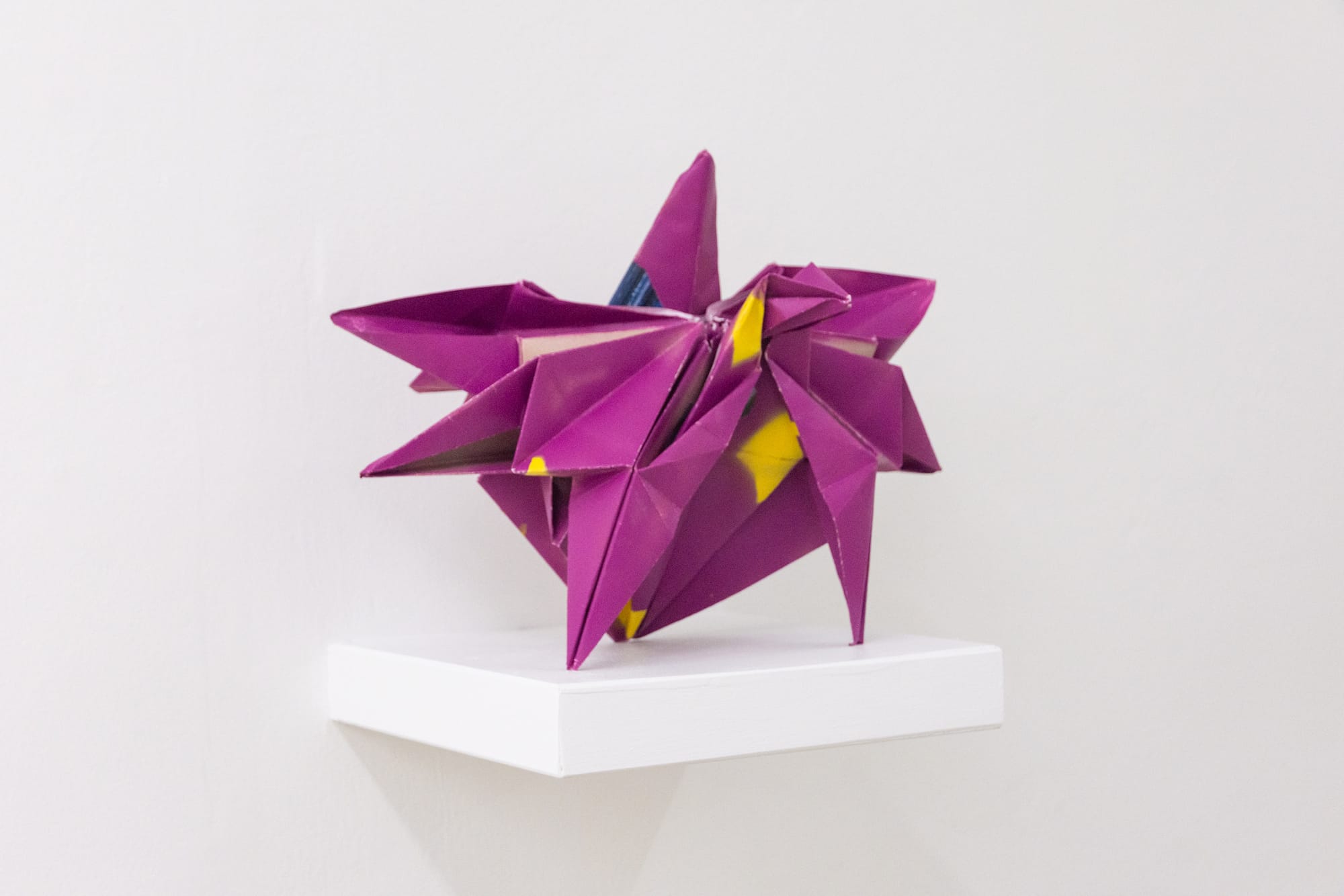 A series of six models, each made from a piece of 2.5-square-foot paper, fold up into unclassifiable shapes that look ready to jump, walk, or fly off their shelves. One is unfolded and framed flat, a generous move that reveals a complex web of creases, dashes of paint that feel instructional, and collaged photographs of watery landscapes, their horizons lined up with individual folds, as if the world were being bent. Each is painted, and named for, the flavor of a Dum-Dum lollipop, including “Mystery,” which of course is purple. The oldest works in the show explain the reference: a handful of tiny action figures folded from those candy wrappers, exactly the kind of thing a kid would make for their own amusement, if that kid were deeply accomplished at origami.