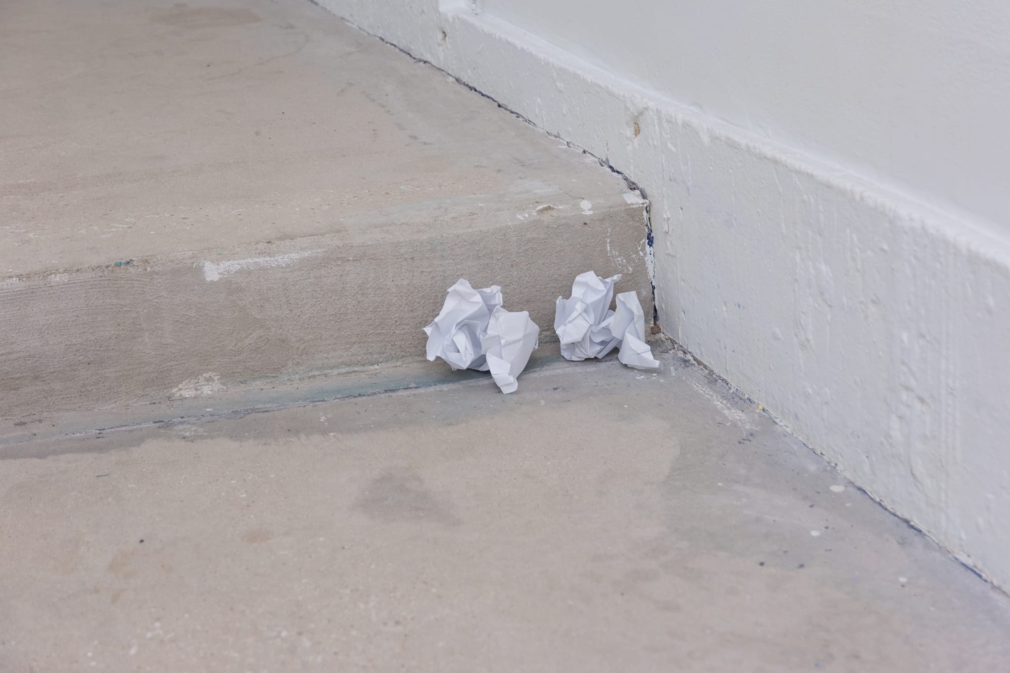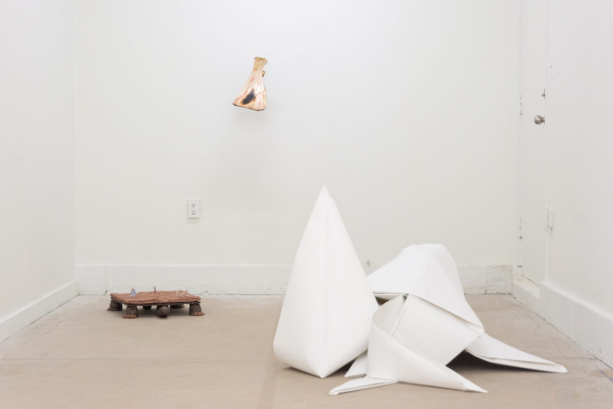 This is not what Lin presents at Compound Yellow, an artist-run gallery and garden in Oak Park. Petal Fold, Rabbit Ear, Inside Reverse is named for classic origami moves, and it is full of the artist’s unusual origami models. This comes as a surprise, although it is not hard to imagine how well the skills of garment-making and origami relate. The largest model in Petal Fold is the size of a human body, a dainty but dirty figure arranged from a 12-foot-square sheet of plain white paper, featureless, laid out on the floor very still, legs crossed. The most paradoxical works are four pieces of crumpled paper scattered about, except they are identical, meaning they are not crumpled paper at all but rather origami that follow a mind-bendingly intricate pattern to replicate a wad of paper. Casual things can be the hardest to achieve intentionally.