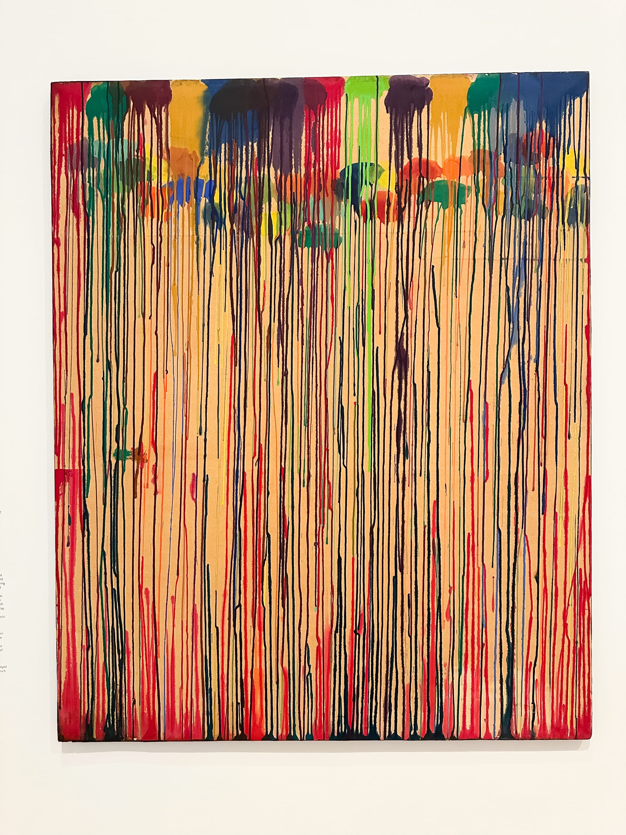 Amid this upheaval, artists in Korea were learning about global avant-garde art movements through magazines, lectures, and participation in international biennials. They were searching for a way out of the Arte Povera-meets-Abstract Expressionist impulse of Korean Informel painting, which many artists felt represented institutional, conservative taste. Some responded through painting: They adopted a flatter and almost colder way of handling paint, as in a gorgeous example from Lee Seung-jio’s Nucleus series (1968–74), included in the exhibition. His signature motif of stacked pipe-like forms is a rejection of Informel’s expressive paint handling as well as a reflection on the new shapes and forms that accompanied the rapid industrialization happening around him. In contrast to the muddy hues of Informel, Lee Hyang-mi’s triptych “Color Itself” (c. 1970s) uses highly saturated colors, which drip down from the top of each painting. The thin bands of watered-down paint cross and mix with each other as they travel down the works, adding an element of chance as well as making gravity and the paint itself collaborators in the process of creation. Notably, Lee is one of the exhibition’s few female artists — a reminder of the highly patriarchal and conservative gender roles in Korea at the time.