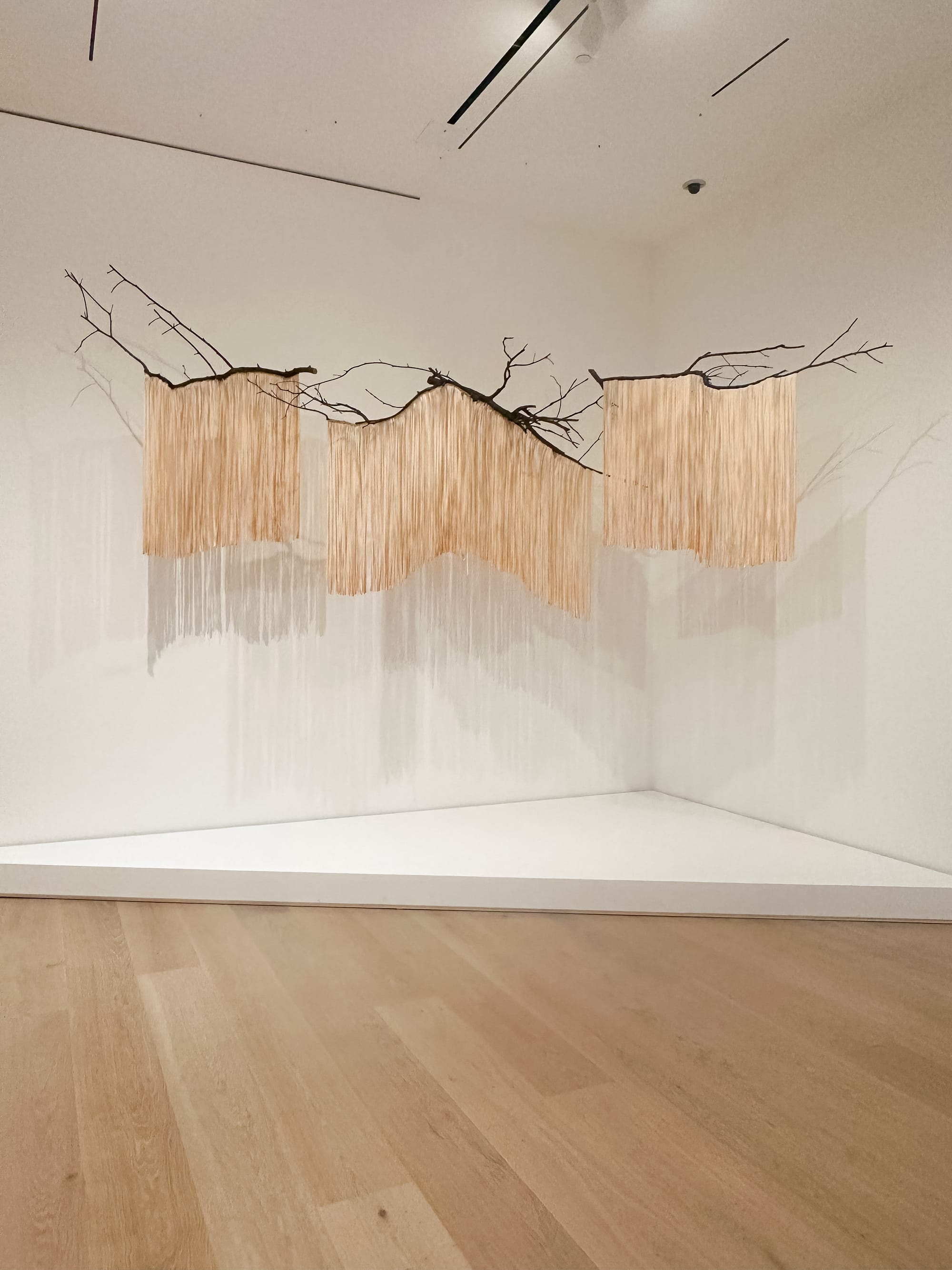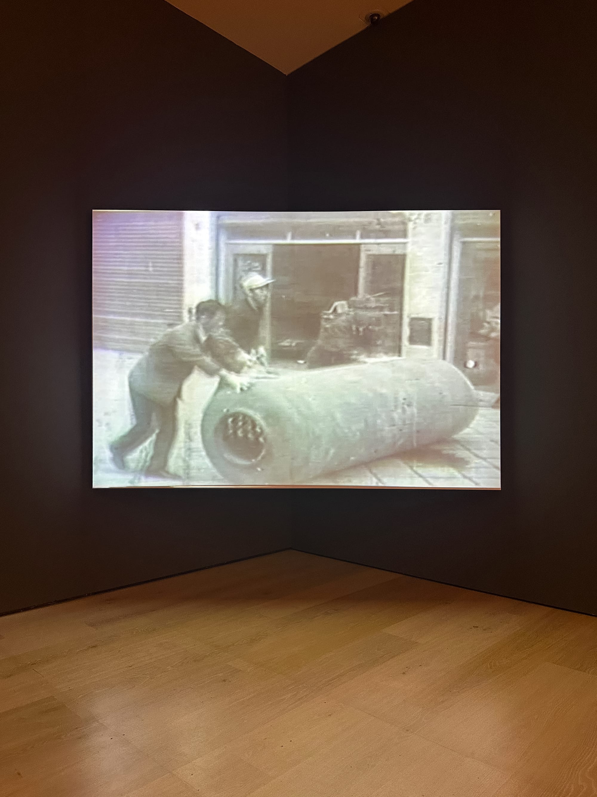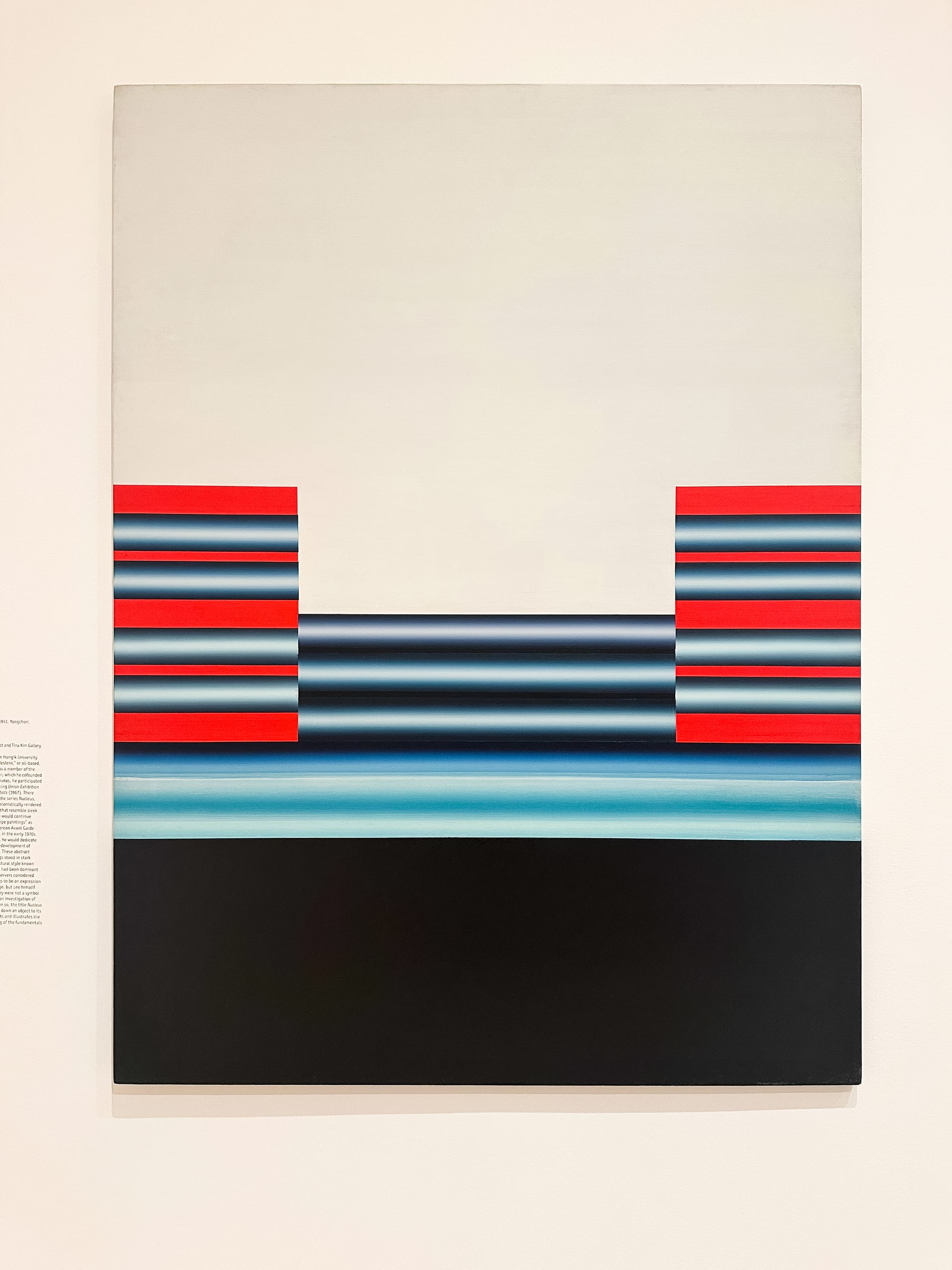 Others searched for ways to inject traditional Korean objects and ideas into their work. In “Situation” (1967–68), Moon Bok-cheol combines bak, hollowed-out dried gourds traditionally used in Korean homes as bottles, with a more Western style of monochrome painting. Lee Sung-taek, too, incorporated Korean folk and cultural objects, as shown by a room dedicated to his work. An installation of several large sculptures called “Untitled (Sprout)” (1963/2018) are based on and mimic the form of onggi, traditional Korean earthenware vessels. And works like “Tied Stone” (1958) reveal his decades-long fascination with tying, initially inspired by godeuraetdol, small stones that traditionally served as weights in Korean weaving looms used to make sedge mats.