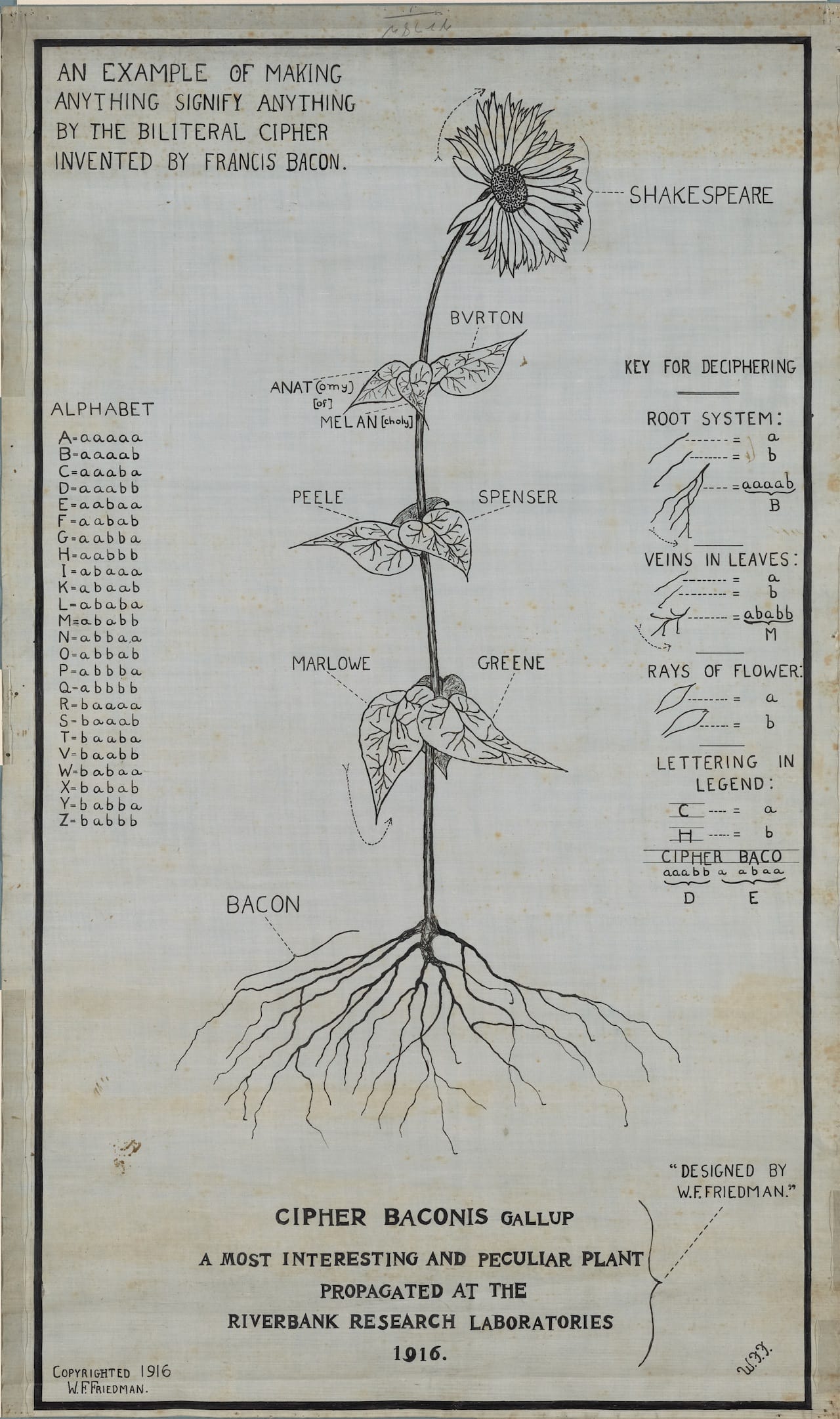 Why Bacon got wrapped up into Shakespeare and later contemporary military codes goes back to his idea for the biliteral cipher. The cipher used a two-letter system of A’s and B’s in five-letter combinations, but any two things could be substituted, so it’s possible to embed it almost anywhere. As Friedman put it, “signify omnia per omnia (anything by means of anything),” an idea he illustrated in a 1916 drawing of a flower. In another example, Friedman staged a military officers photo where by the A’s looking at the camera and B’s looking away, they spell out Bacon’s axiom “knowledge is power” (which Friedman had carved on his and Elizebeth’s grave). You can see the photograph discussed by curator Bill Sherman in this video, with more images from Decoding the Renaissance below.