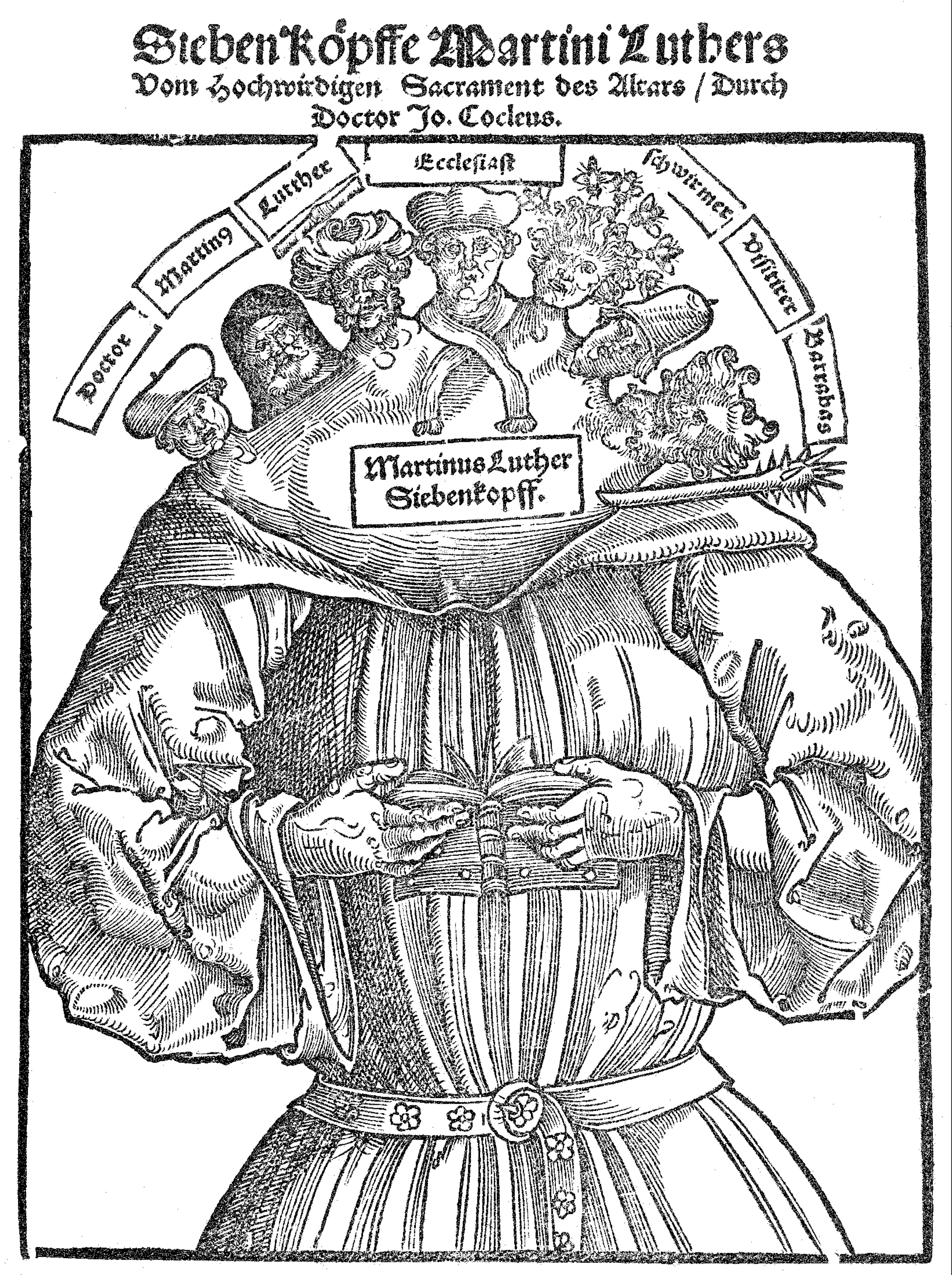 Having learned something about persuasive mass media from Cranach, anti-Protestant polemicists began to print their own propaganda. If the Catholic Church was depicted as a monstrous ass by Cranach, then printmaker Hans Brosamer would imagine the father of the Reformation as an apocalyptic beast in “The Seven-Headed Luther” (1529), conflating him with the Dragon from Revelation. To Brosamer, Luther was a heretic, a zealot, and a murderer, among other things, his identity as riven as the schism he instigated within the Church. According to the accompanying text, Luther was a madman who “preaches what the mob wants to hear.”