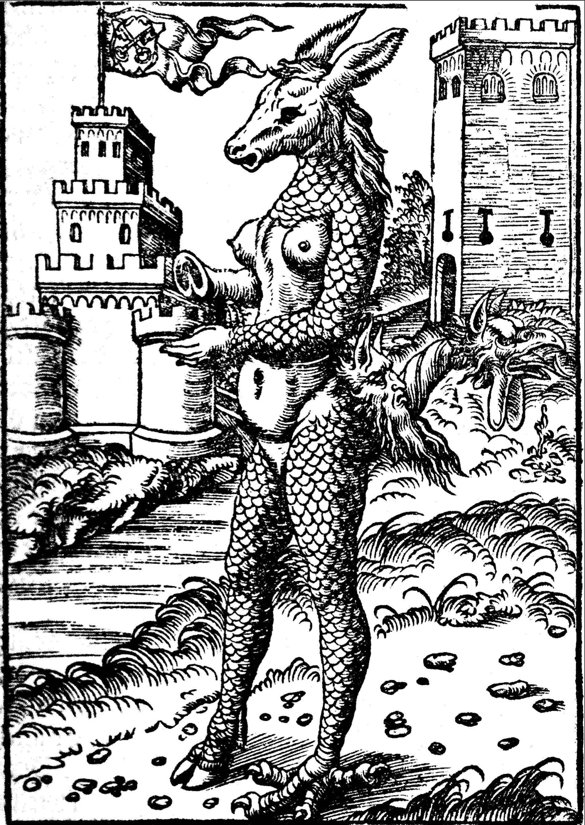 Printed in 1523, with text from Luther and his lieutenants, Cranach’s unequivocally titled woodcut broadsheet “The Papal Ass” was a prime example of the painter’s propagandistic duties. In it, the Catholic Church is a chimerical nightmare composed of the bare-breasted body of a woman with a donkey’s head and reptilian arms and legs, one foot cloven and the other clawed. Behind this freakish creature is a clear view of Rome’s Tiber River, Castel Sant'Angelo and the Papal Prison visible along its banks. It was scandalous and obscene, offensive and blasphemous — and effective.