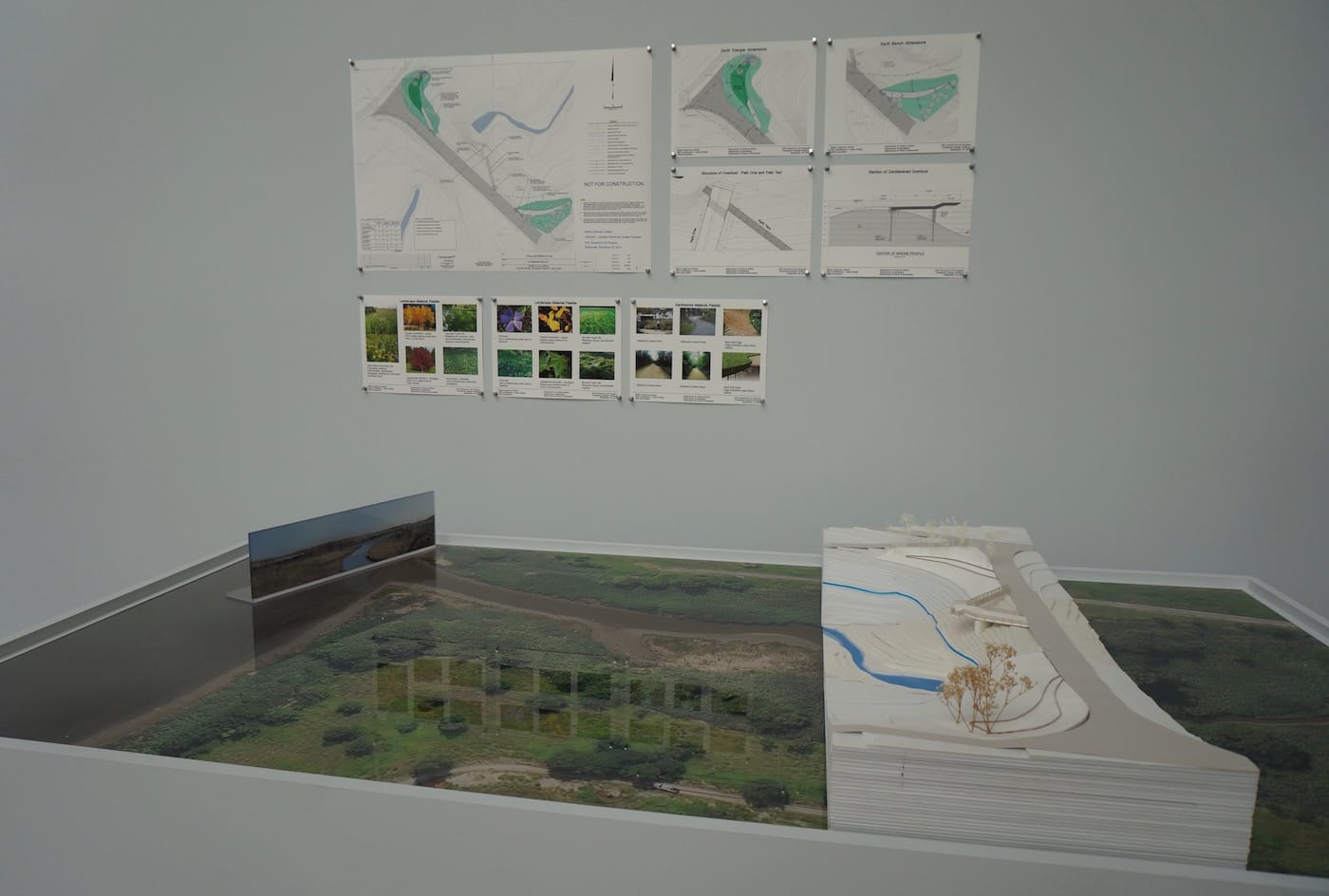 Arguably, though, Ukeles’s most effective enactment of maintenance art has come in her fulfillment of the third part of her early manifesto: earth. The Queens Museum atrium is devoted to the artist’s work on Fresh Kills, a massive Staten Island landfill that’s currently undergoing a 30-year process of being transformed into a park, as well as two other, smaller landfills. Lined with drawings, renderings, plans, and videos, this section of the show is the least eye-catching, but one of the most meaningful.