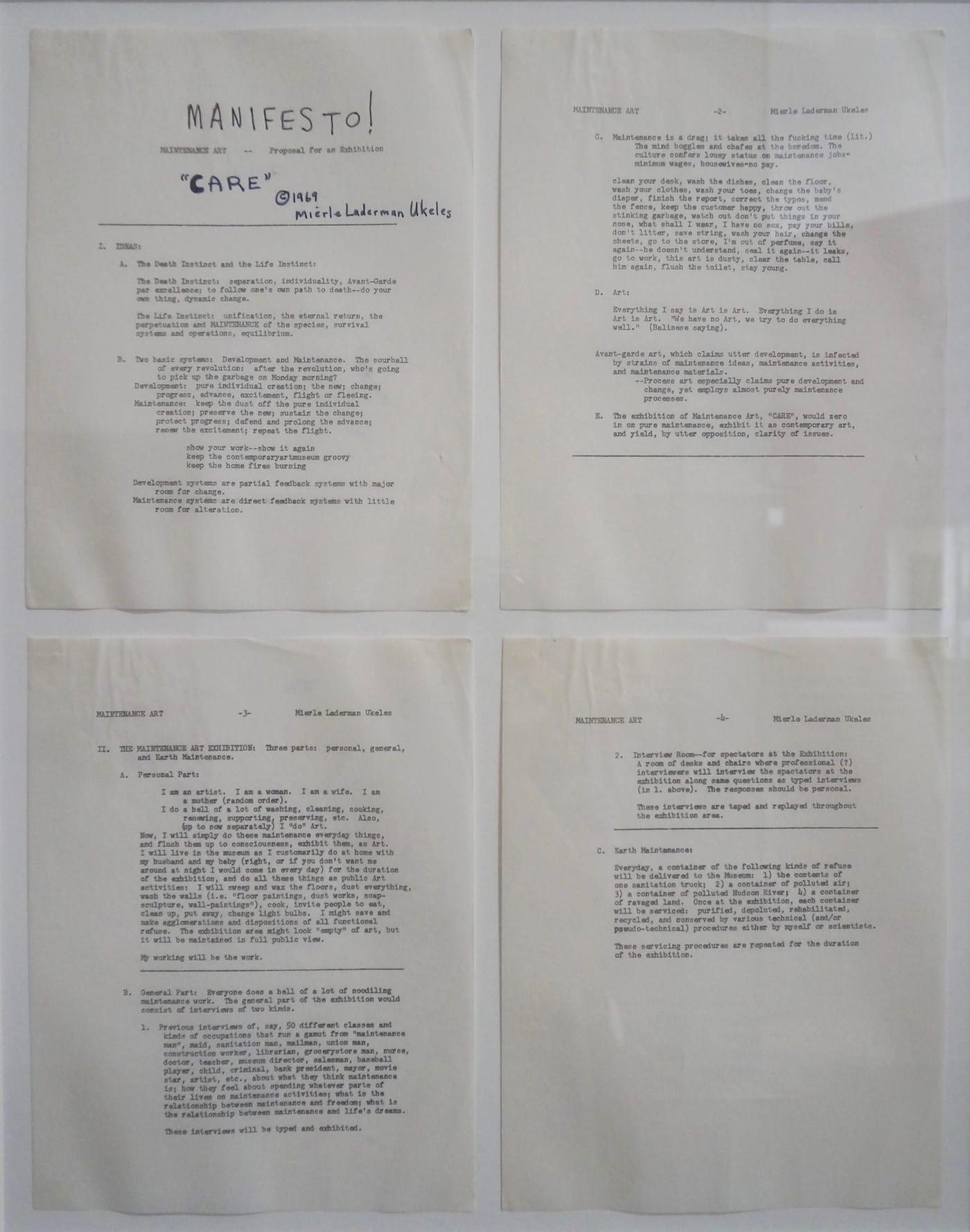 “Manifesto for Maintenance Art 1969!” is a brilliant, three-and-a-half-page, typewritten document divided into two parts. In the first Ukeles lays out the distinction between what she calls “two basic systems: Development and Maintenance.” The former, associated with the avant-garde and implicitly male, is concerned with “pure individual creation; the new; change; progress, advance, excitement, flight or fleeing.” The latter includes tasks generally associated — at least in the private sphere — with women and domestic work: “keep the dust off the pure individual creation; preserve the new; sustain the change; protect progress; defend and prolong the advance; renew the excitement; repeat the flight.” The problem, Ukeles notes, is that our culture values development, while maintenance “takes all the fucking time.”