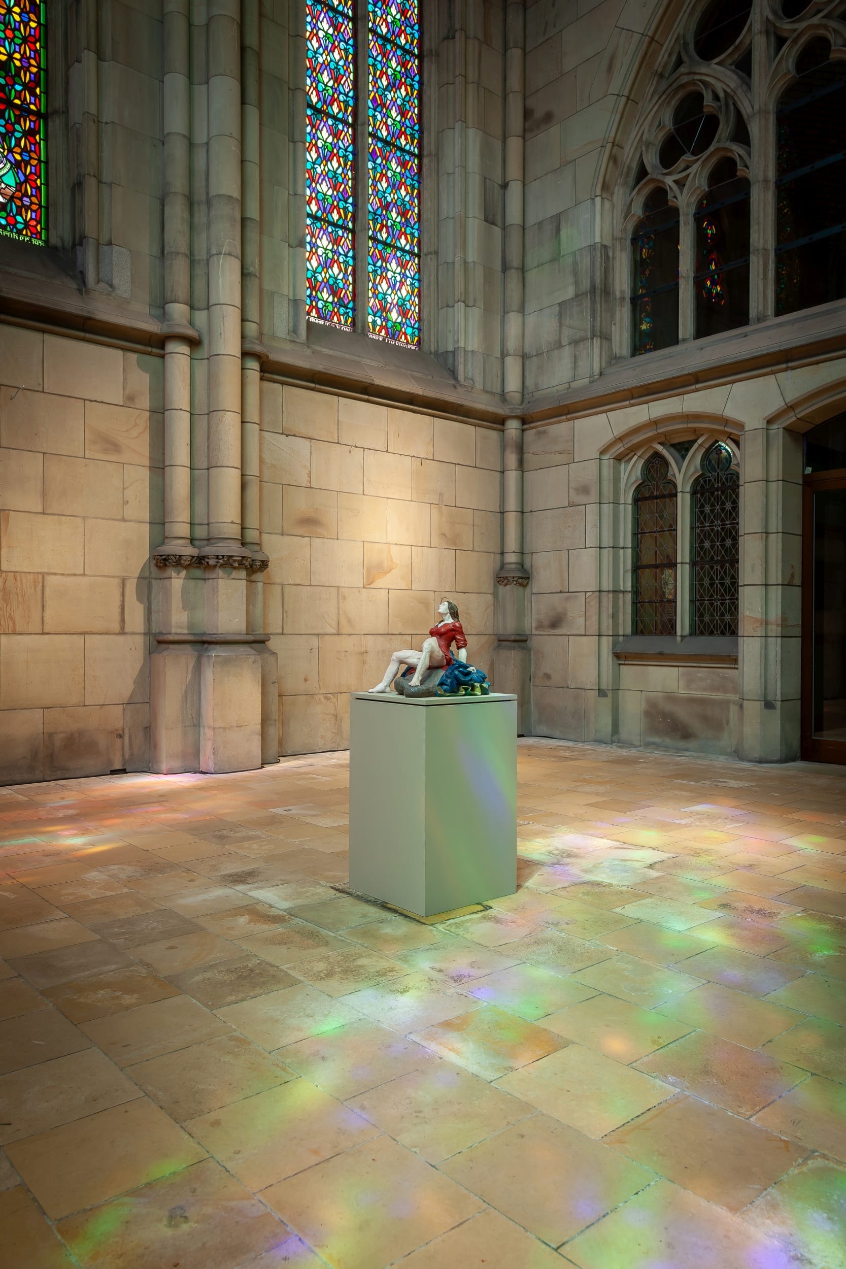 A similar sentiment compelled the contemporary Austrian artist Esther Strauss, whose small sculpture “Crowning” (2024) was until recently installed in St. Mary’s Cathedral in Linz, Austria. Strauss’s Madonna depicts a young woman in a red dress hiked around her hips, face upturned in anguish and legs spread wide to deliver the Son of God. Part of an exhibition about women in the arts, “Crowning” focuses on the moment of incarnation, of God being gestated in a woman’s womb. Arguably the most distinctive aspect of Christian theology, a tenet of orthodoxy that ironically remains perennially uncomfortable to some orthodox believers, is the doctrine of the incarnation. “And the Word became flesh and dwelt among us,” as John 1:14 intones, which means a Christ who ate, slept, defecated, urinated, and was born, with all of the messy and painful particulars that birth implies. Strauss said her work is one in which “Mary gets her body back.” After centuries of art about Christ’s violent death, the sculpture is similarly honest about his birth.