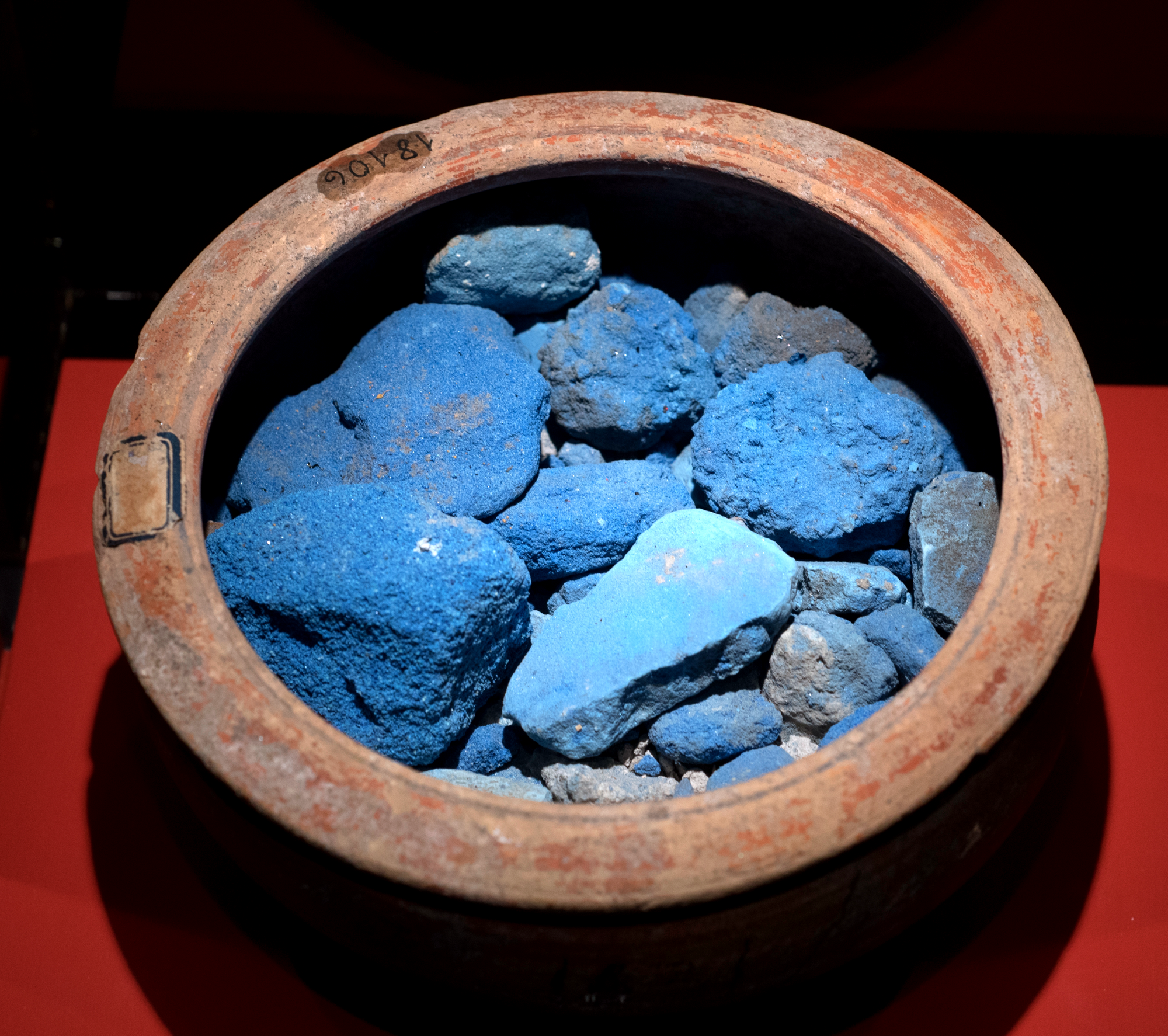 Blue is a beautiful yet difficult hue to replicate in the natural world. The pigment made from Lapis lazuli was difficult to procure, mined from the far-off mountains of Badakhshan in what is today northeastern Afghanistan. It was (and still is) a precious commodity. Necessity bred innovation in antiquity, which is how Egyptian blue came into being. Pigment makers created the color with a mix of heated sand, lime, copper, quartz, and an alkali flux. The artificial blue pigment is attested within Ancient Egypt around 3300–3200 BCE. It later became popular in Anatolia and Mesopotamia. In the first century BCE, the architectural writer Vitruvius noted its existence, as well as the Roman term for it: caeruleum. At that time, Egyptian blue was already being made in Puteoli, a city on the Bay of Naples near Pompeii.