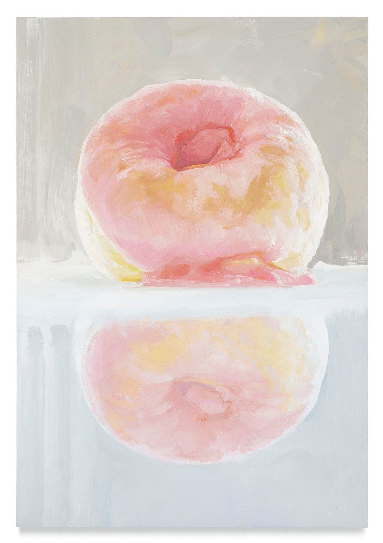 There are 14 oil paintings on panel, all measuring 26 by 18 inches, in the exhibition Emily Eveleth at Miles McEnery Gallery (October 21-November 27, 2021). Despite working within strict limitations of scale, and with the same subject, Eveleth does not repeat herself; her doughnuts do not become stale. From painting to painting, the lighting, composition, color, and even paint handling change, as does the mood.