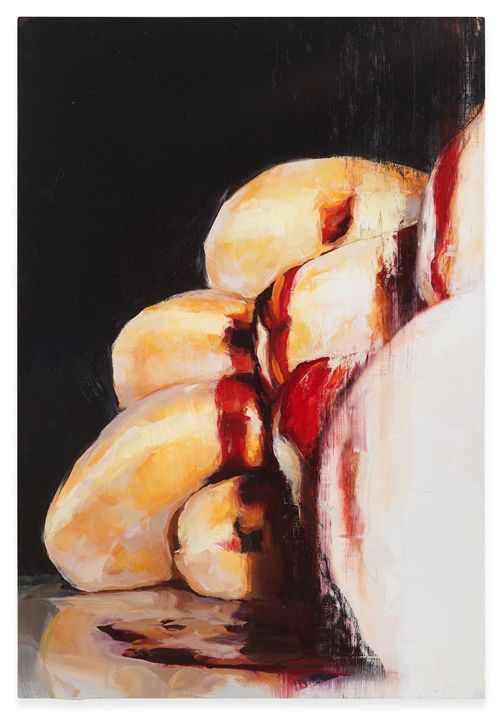 At the same time, what does it mean to be looking at syrup-filled torsos? Is this a body or a body part? This infuses the work with a disquieting edge. Are we looking at them as scenes of violence? This sense of possible violence is particularly true of “Curtain” (2021), a stack of doughnuts seen close up, all of which seem to be dripping cherry-red syrup.