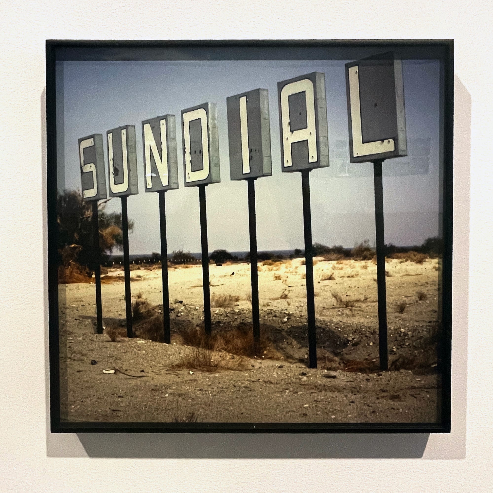 One such visual poem in Locating Perception is found in the tiled photographs of the series California Sun Signs (1972). Traveling throughout the state, Holt found the word “sun” calling to her in many forms. It would often jump from Googie-style motel signs or hide within another word, such as “sundial,” that sought to evoke California’s signature trait. Holt fittingly captures the texts in broad daylight, white-hot sunshine bouncing off the signs or rays bleeding into the frame, washed out by their namesake.