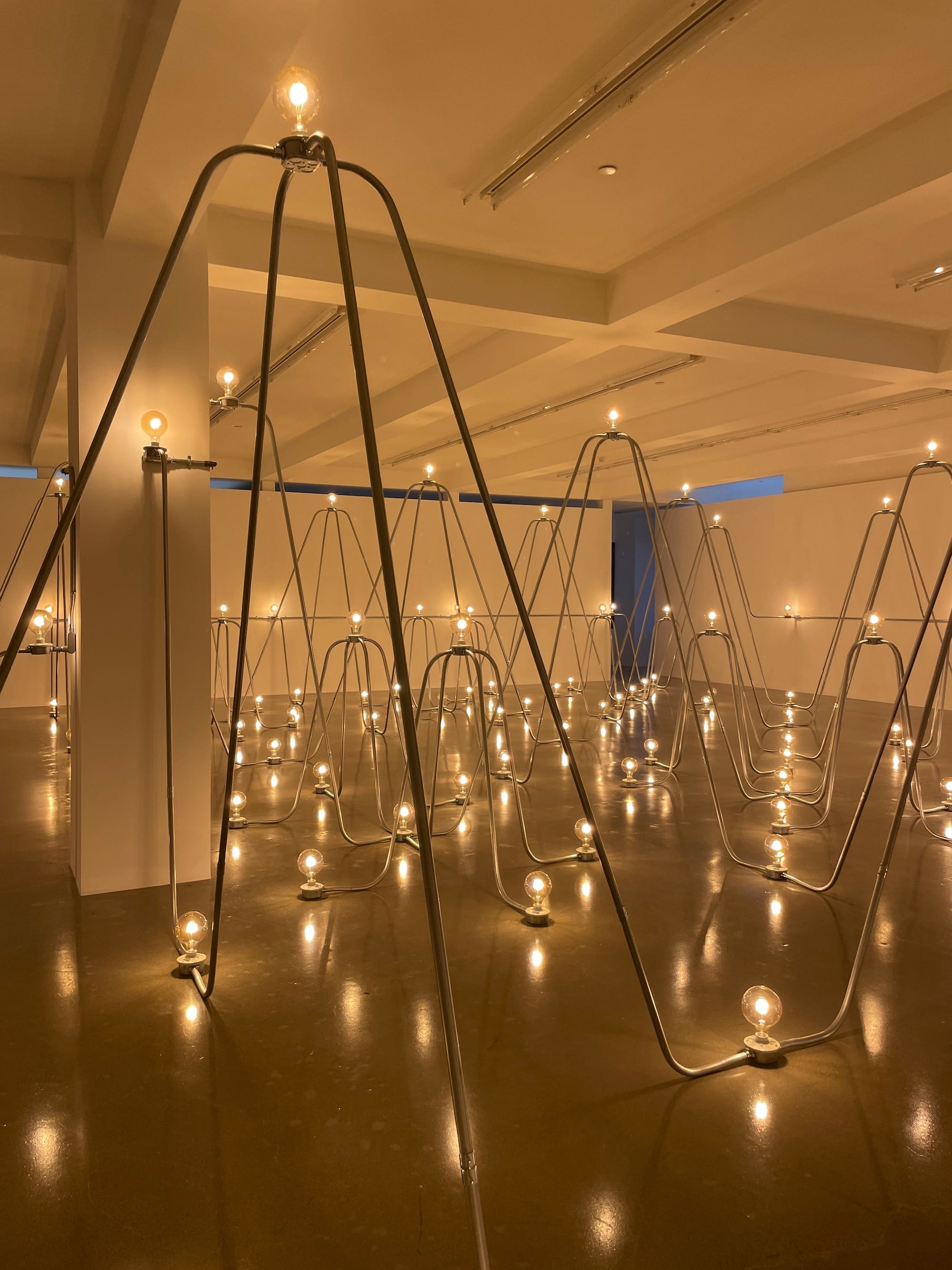 The relationship between old architecture and modern vibes also plays into her stunning installation “Electrical System” (1982). The maze of metal conduits and filament bulbs fills most of Sprüth Magers’s second floor. Viewers are invited to carefully step through the sculpture, where the steel tubes converge into mountainous peaks reaching almost to the ceiling, topped by a lightbulb.