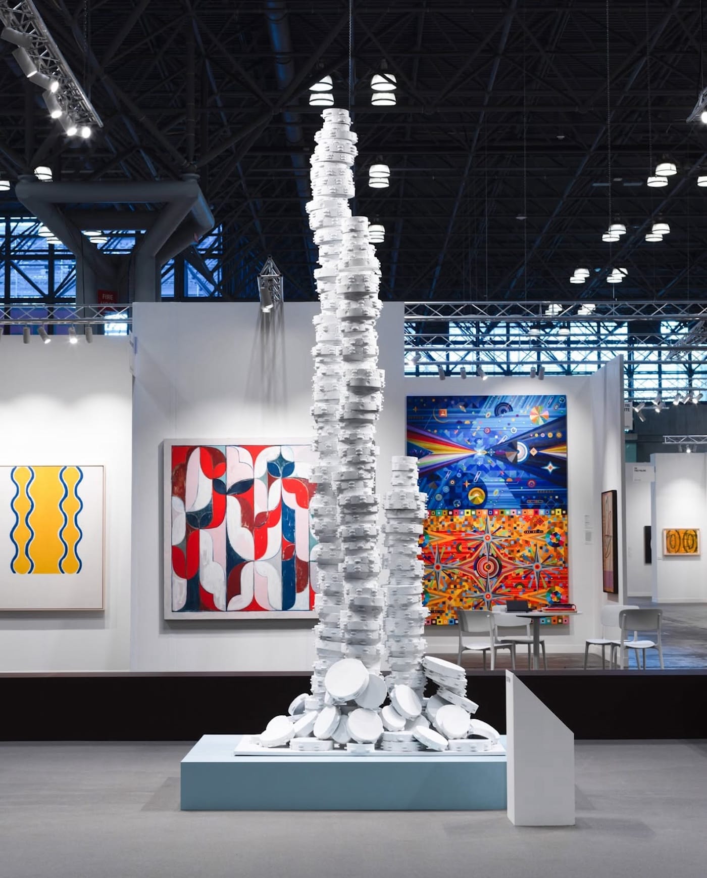 Garth Greenan’s consistent focus on work by Native artists over the past five years, including Jaune Quick-to-See Smith, James Luna, and Fritz Scholder, continues, displaying Cannupa Hanska Luger and Mario Martinez at the epicenter of their booth. Like Britton’s curation, Greenan’s similarly educates non-Native collectors about individual tribal identities rather than treating Native art as monolithic. This focus on representation extends internationally: PRAXIS gallery’s Constantino observed that Latin American collectors show increased interest in fairs in the United States when they see Latine artists represented.