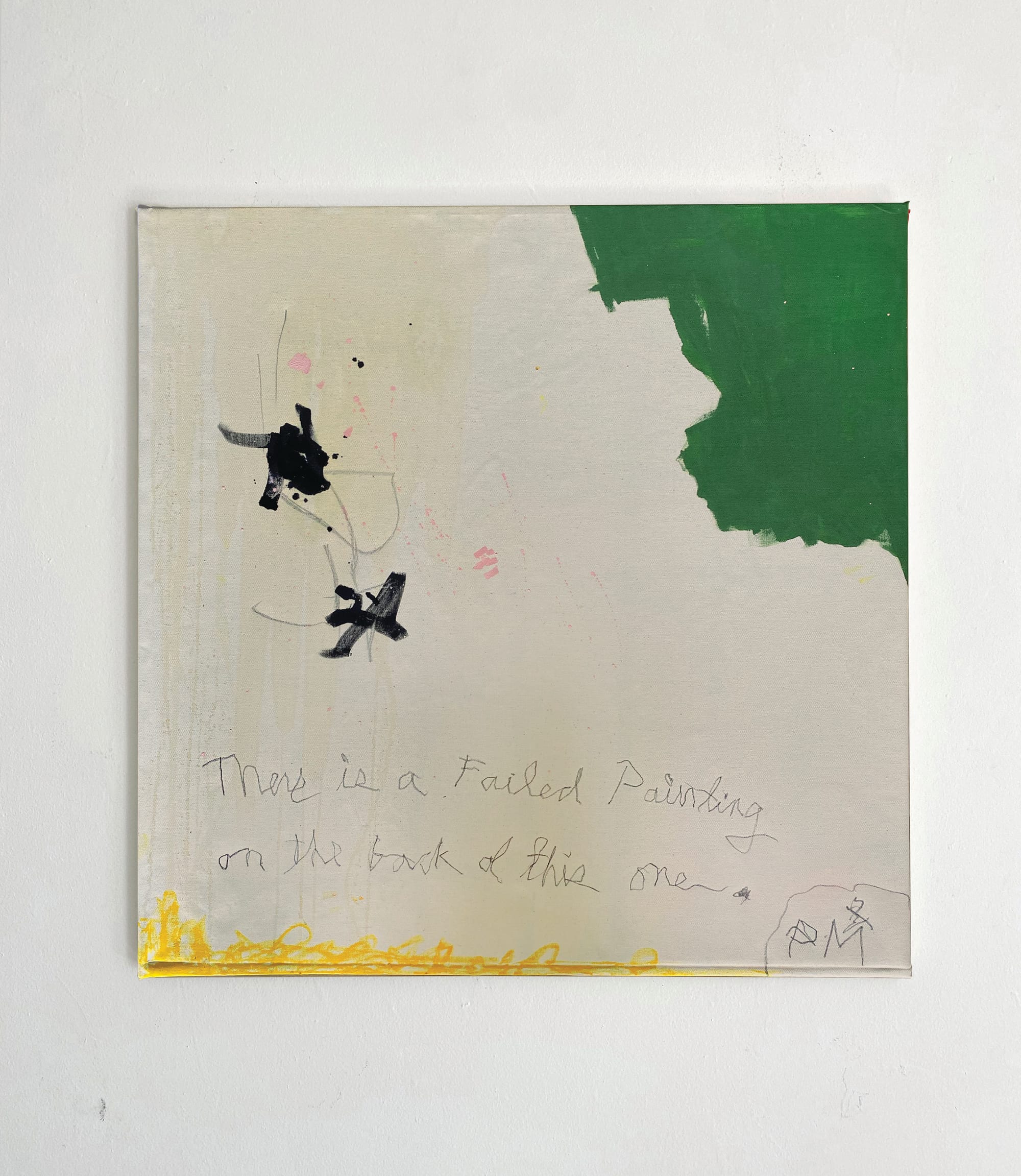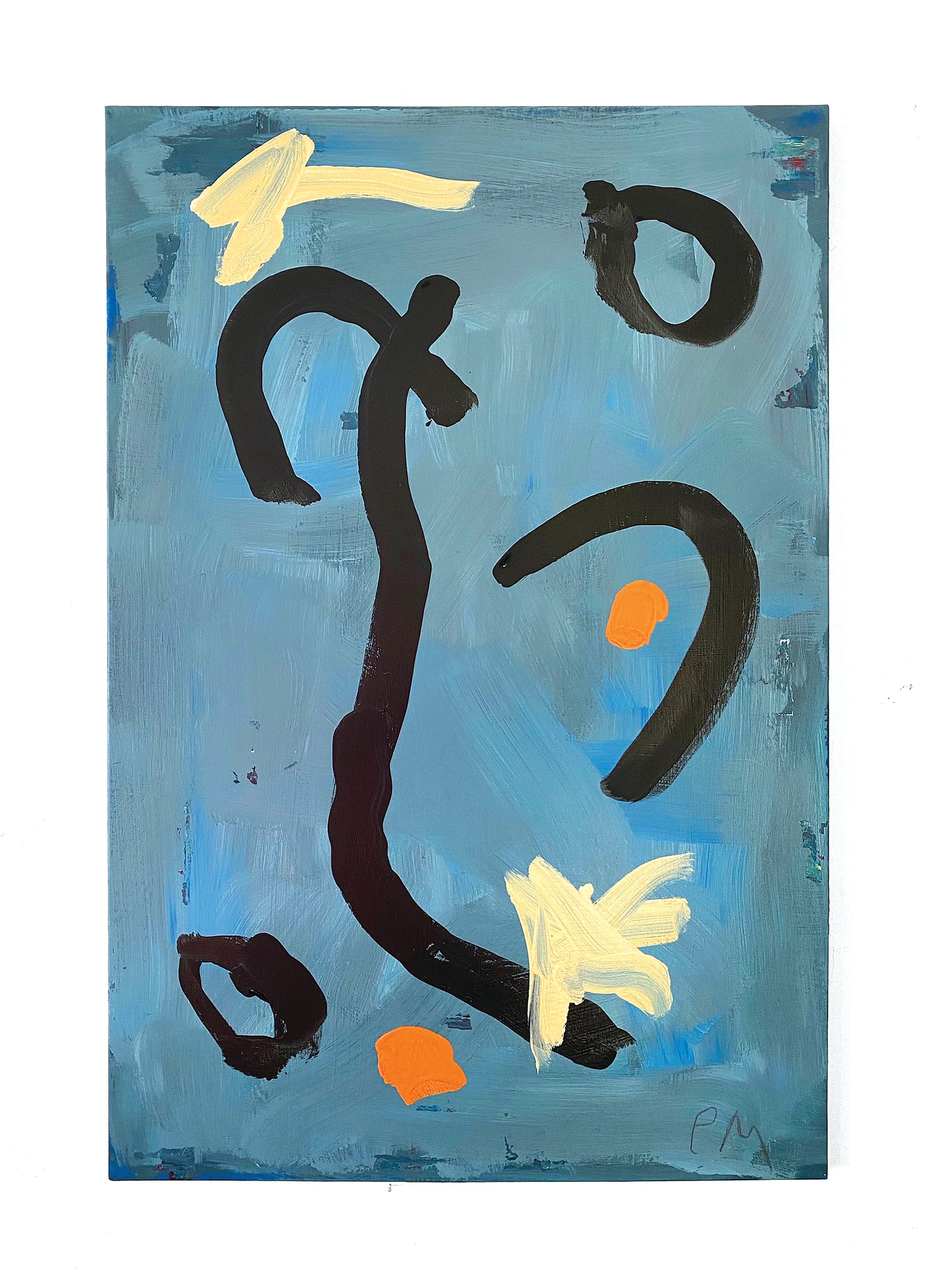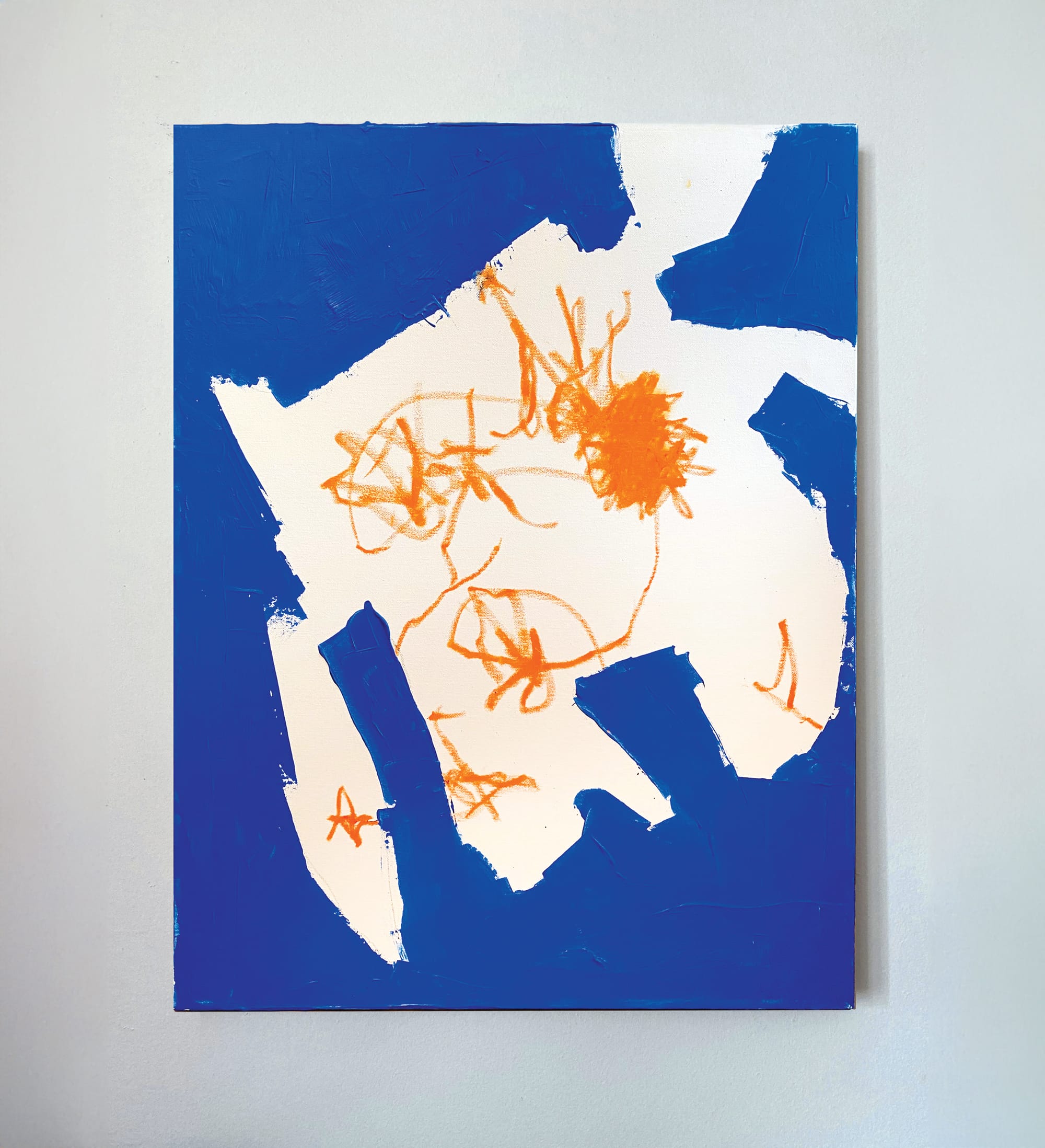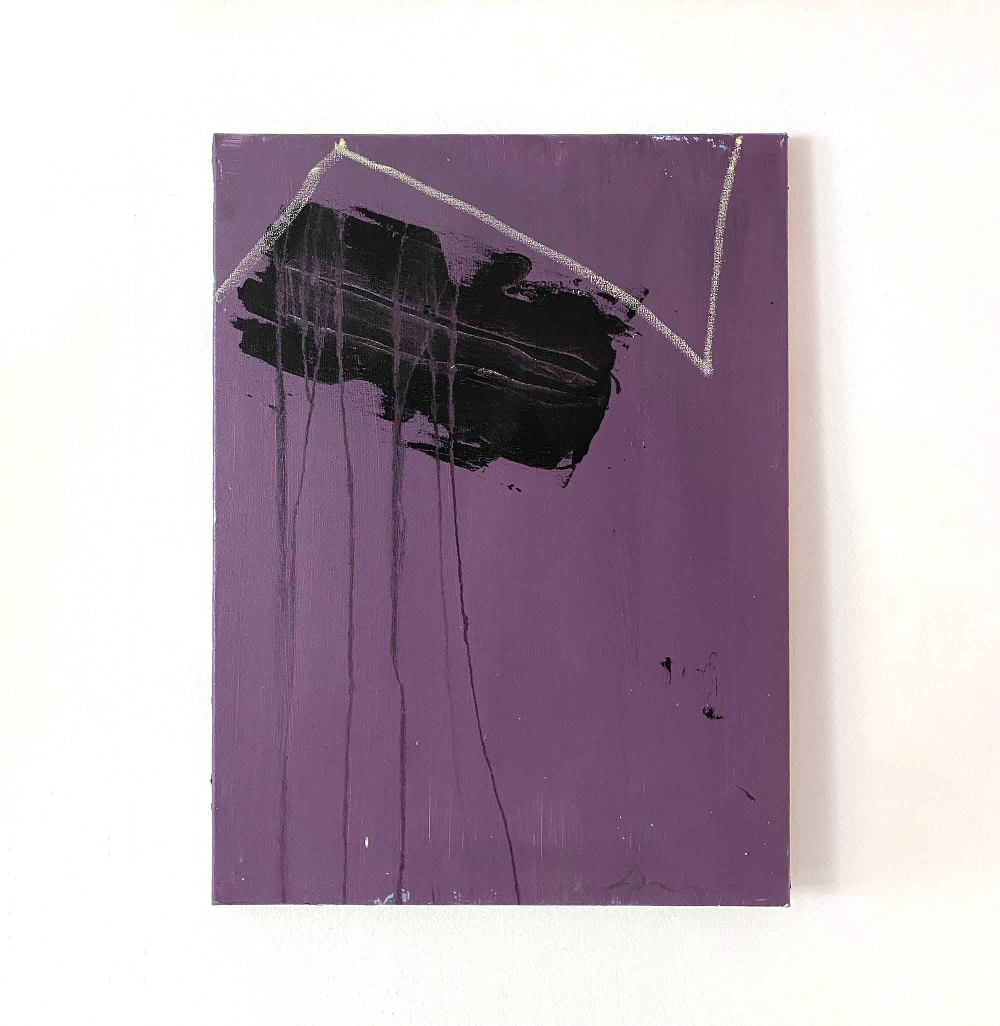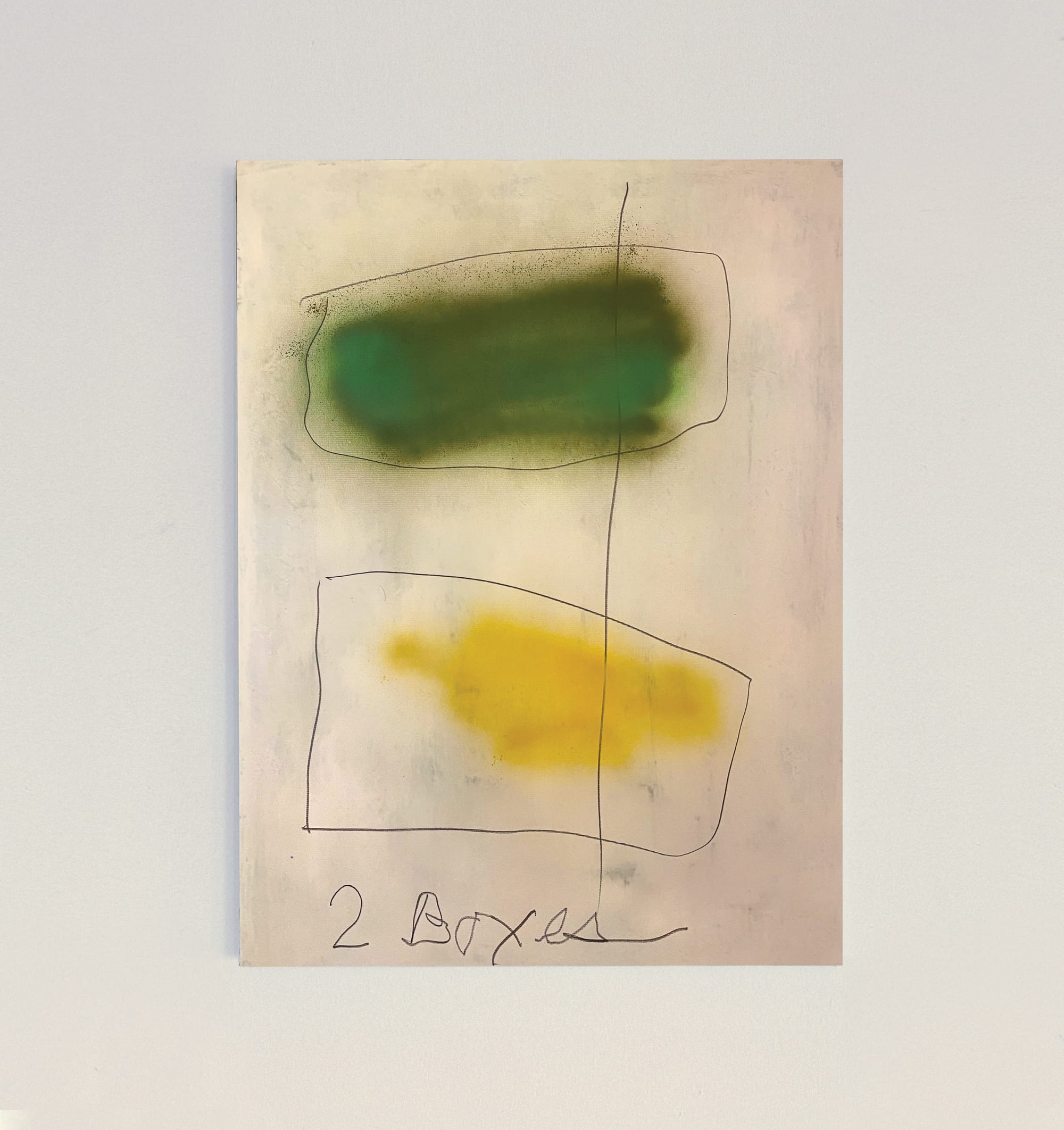 Fittingly, the works that result from this act of self-healing (although painting is far from reductively redemptive, as the journal also examines philosophy, music, literature, friendship, and a host of other searching subjects) are unconstrainedly gestural. Mendelsund’s version of action painting yields work in which acrylics are glopped on, squeegeed, worked over, left to the elements, and written on (using an extension or with his nondominant hand, to avoid preciosity). Other media include rainwater, which lends a delicate melancholy to the surface; coffee; whiskey; mud; spray paint; Sharpie.