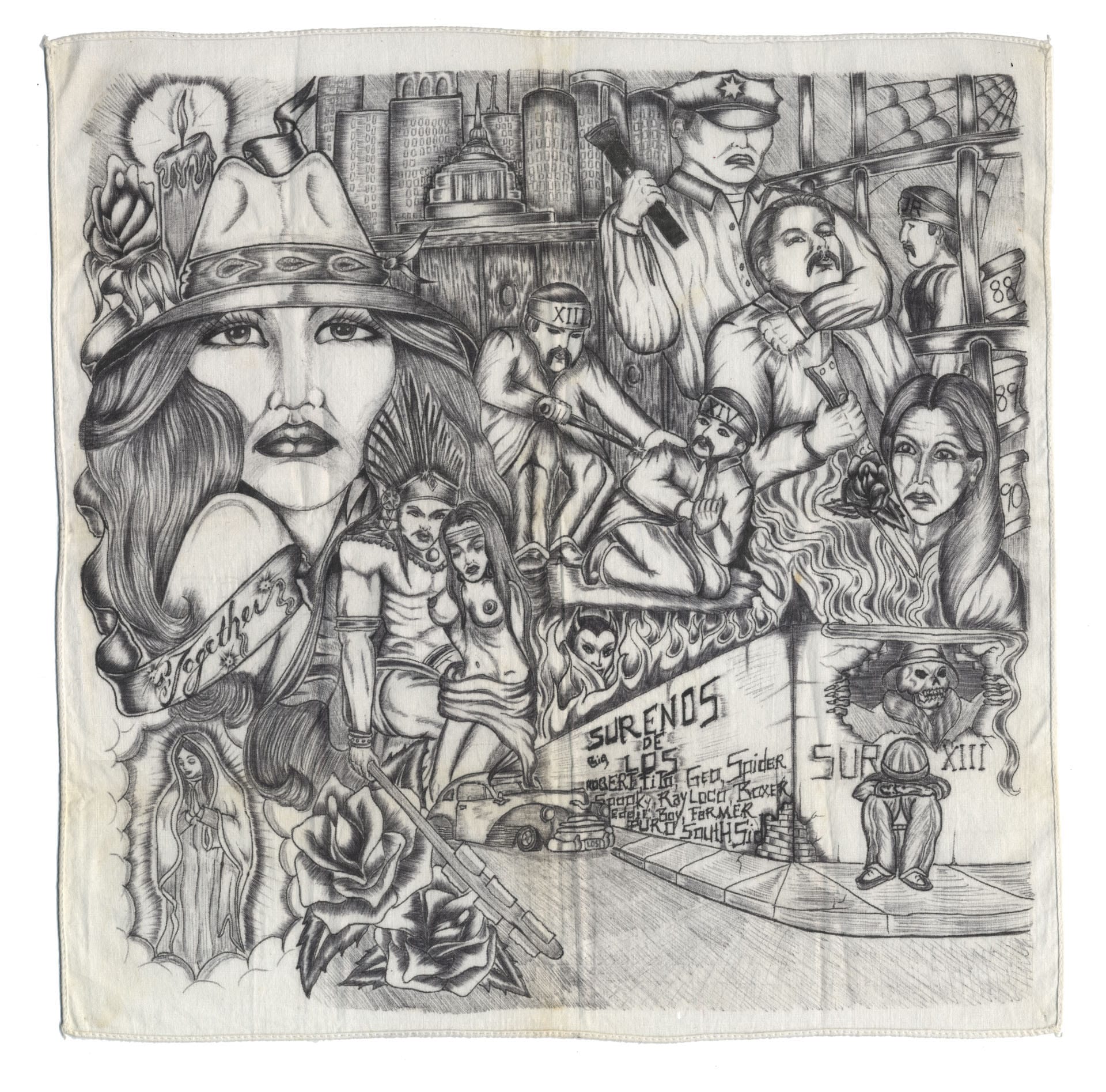If paño arte is the private-facing practice of artists serving time in penitentiaries across the United States, then artepaño encompasses the afterlife of the artifact. Discarded by intended recipients, paños — ink drawings executed on commissary handkerchiefs used to communicate with loved ones — end up in estate sales or second-hand shops. Through bulk donations of second-hand linens, they find their way into thrift stores, antique shops, and flea markets across the American Southwest.