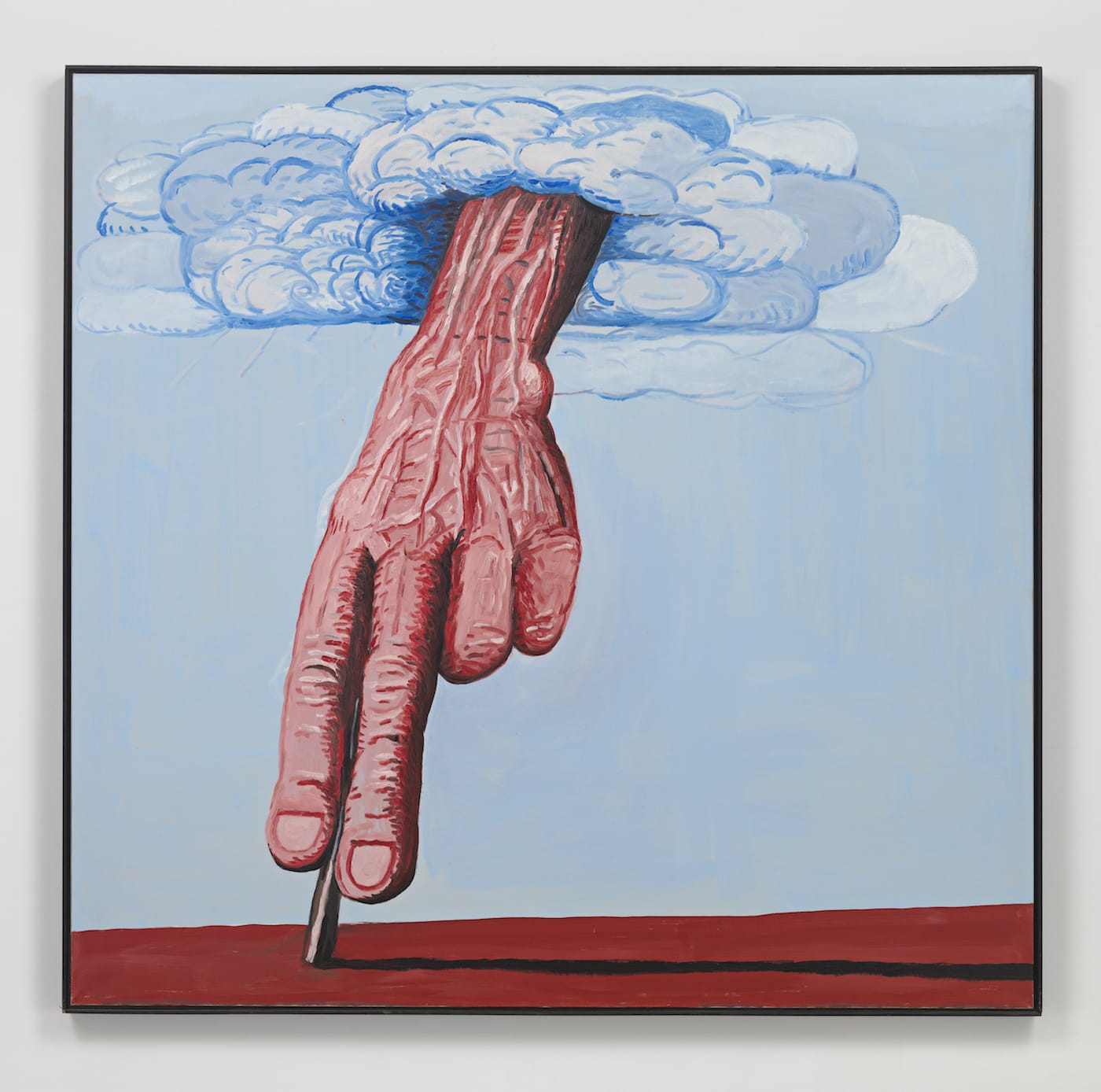 In another space, Guston’s seminal painting “The Studio” (1969), depicting a cigarette-smoking klansman painting a self-portrait in an art studio, is flanked by wall text from Wallace Stevens’s “The Sail of Ulysses” (1957): “The space in which it stands, the shine / Of darkness, creating from nothingness/ Such black constructions, such public shapes / And murky masonry, one wonders / At the finger that brushes this aside / Gigantic in everything but size.” Stevens’s lines succinctly explore the duality of the creative process depicted in “The Studio” and conjure up Guston’s consistent baked-brick color palette. However, this poem relates even more directly to “The Line” — the image used on all promotional images for the show — which features a giant, veiny hand parting a cloud to reach down and paint a line on the earth. Although it resembles a giant phallus, and this masculine claim to conception seems willfully sexist, Guston posits the act of creating something out of nothing as grotesque but also magic; the monumental scale implies the exaggerated magnitude of this act.