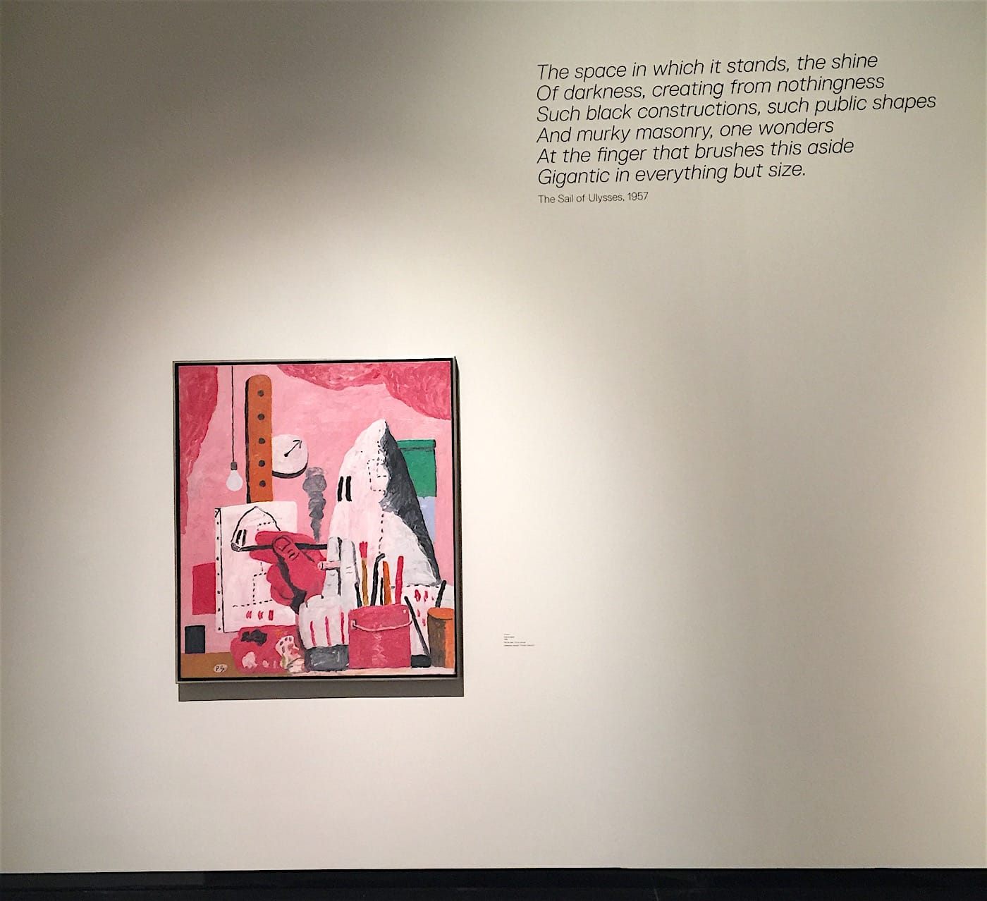 Moving forward into the maze of Guston’s lush and fleshy abstractions, placed beside his figurative canvasses full of wonky hammers, light bulbs, and cartoon figures, you become immersed in a unique physical language. Snippets of poetry function as wall text and punctuate transitions between the works, allowing the curator to offer subtle and elusive commentary on specific paintings, most often without any sort of obvious connection.