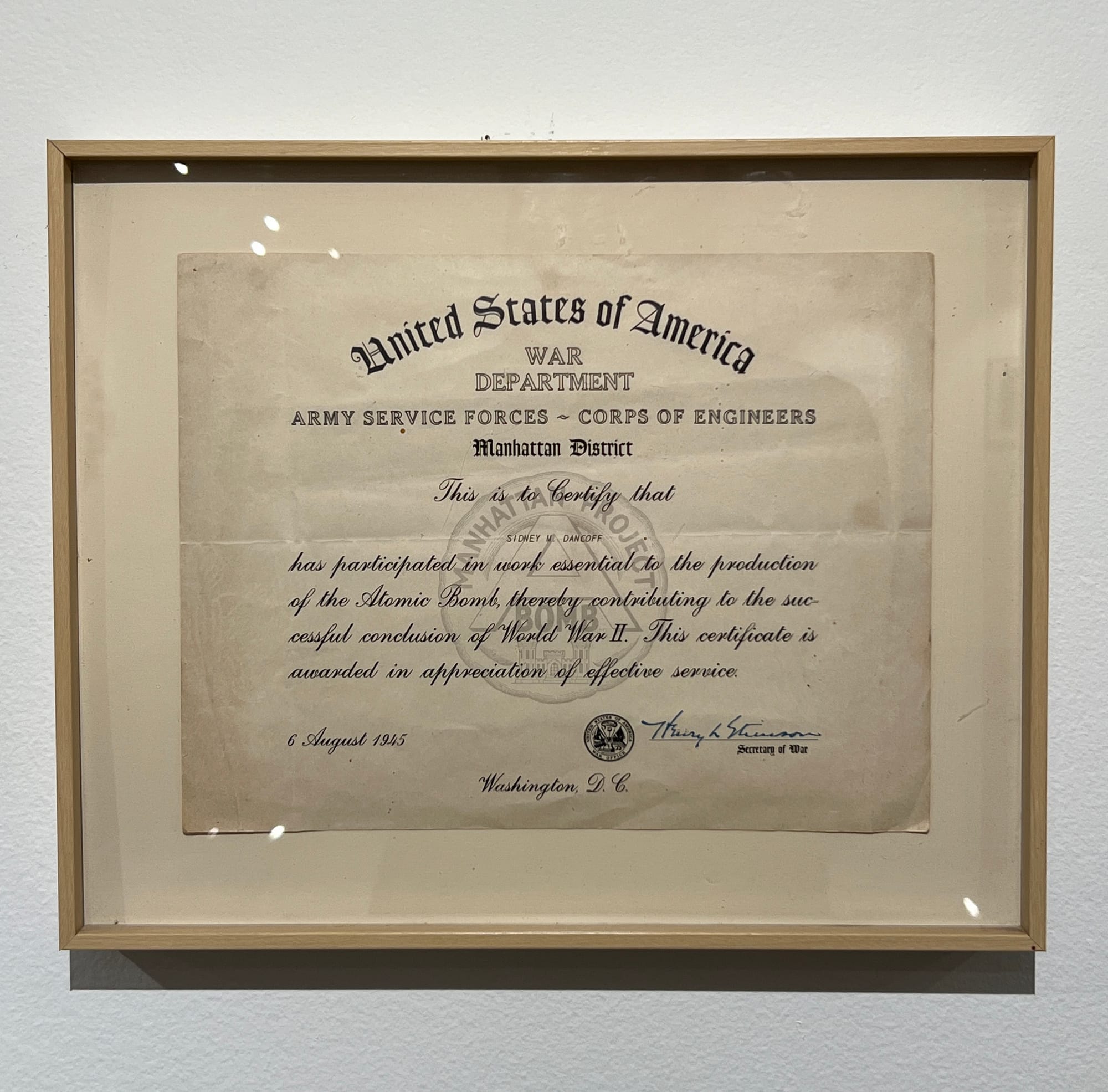 Atomic Dragons concludes in a second room, where the artists staged archival objects in vitrines, such as o’Hara slavick’s irradiated objects collected from exclusion zones. On the back wall hangs a certificate awarded by the War Department to the father of SWANS member Judith Dancoff, preprinted with the date the United States dropped the first atomic bomb on Hiroshima: August 6, 1945. The letter thanks him for his work, calling it “essential to the production of the Atomic Bomb."