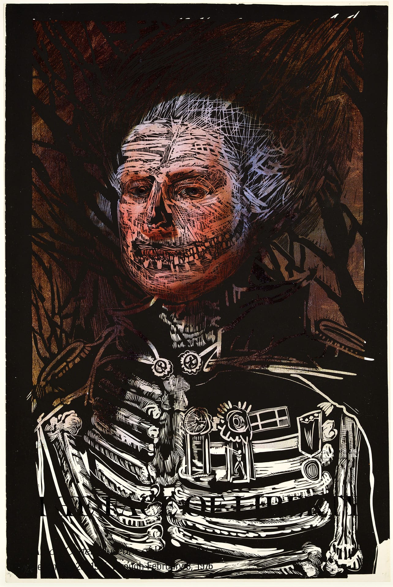 AUSTIN, Texas — National leaders are often commemorated in portraits, but not like this. Simon Bolívar and George Washington — iconic figures in Colombia and the United States — look less than mighty in Beatriz González's and Eric Avery’s pictures of them. Painted during the years of extreme political and social turbulence known as “La Violencia,” González’s “Apuntes para la historia extensa, continuación (Notes for an Extensive History, Continuation)” (1968) depicts the South American hero with dull features and noxious, Pepto Bismol pink skin. And Avery’s linocut “The New Face of Liberty” (1983), created amid the country’s AIDS crisis, covers a found image of the first US president with a scratchy skeleton.