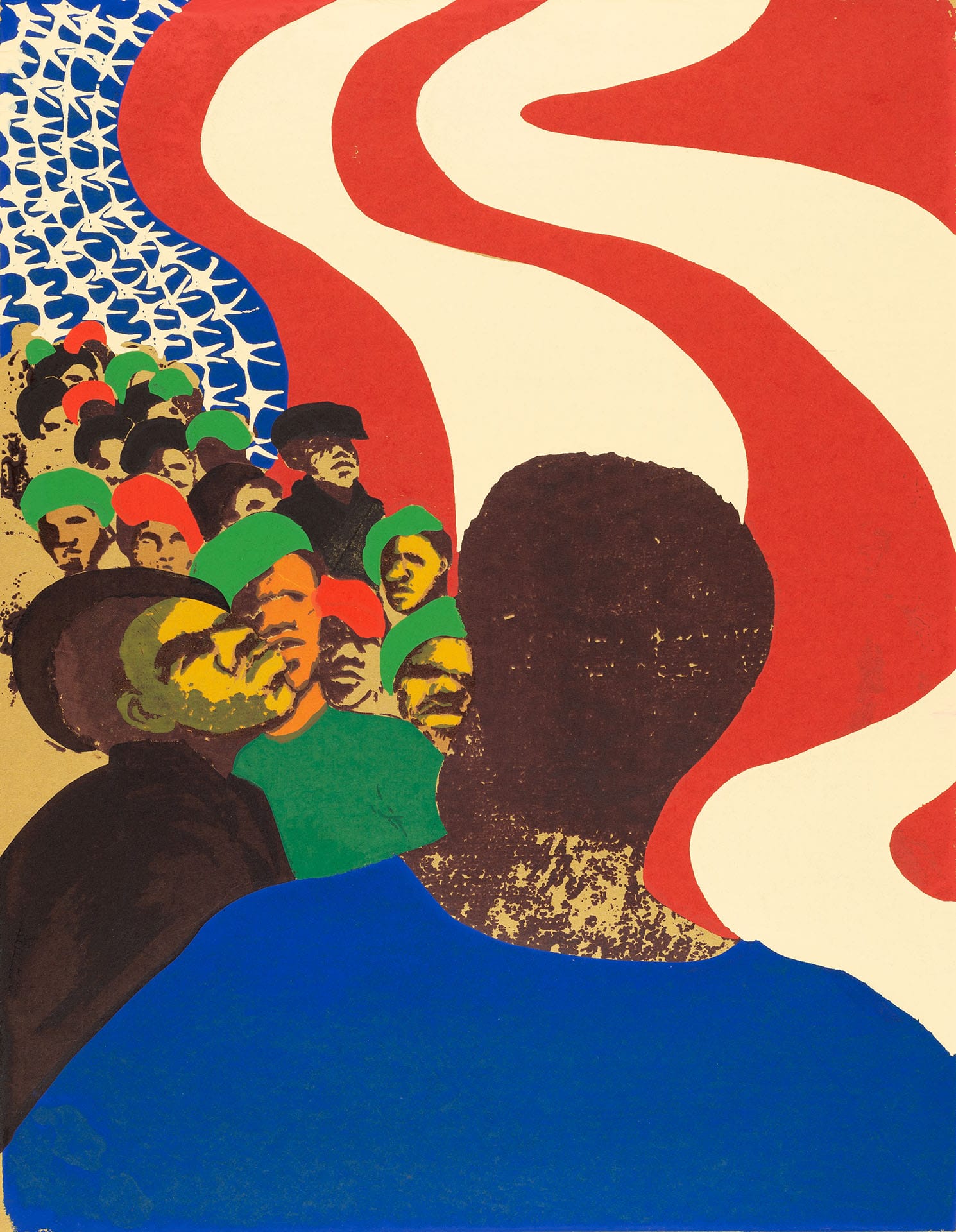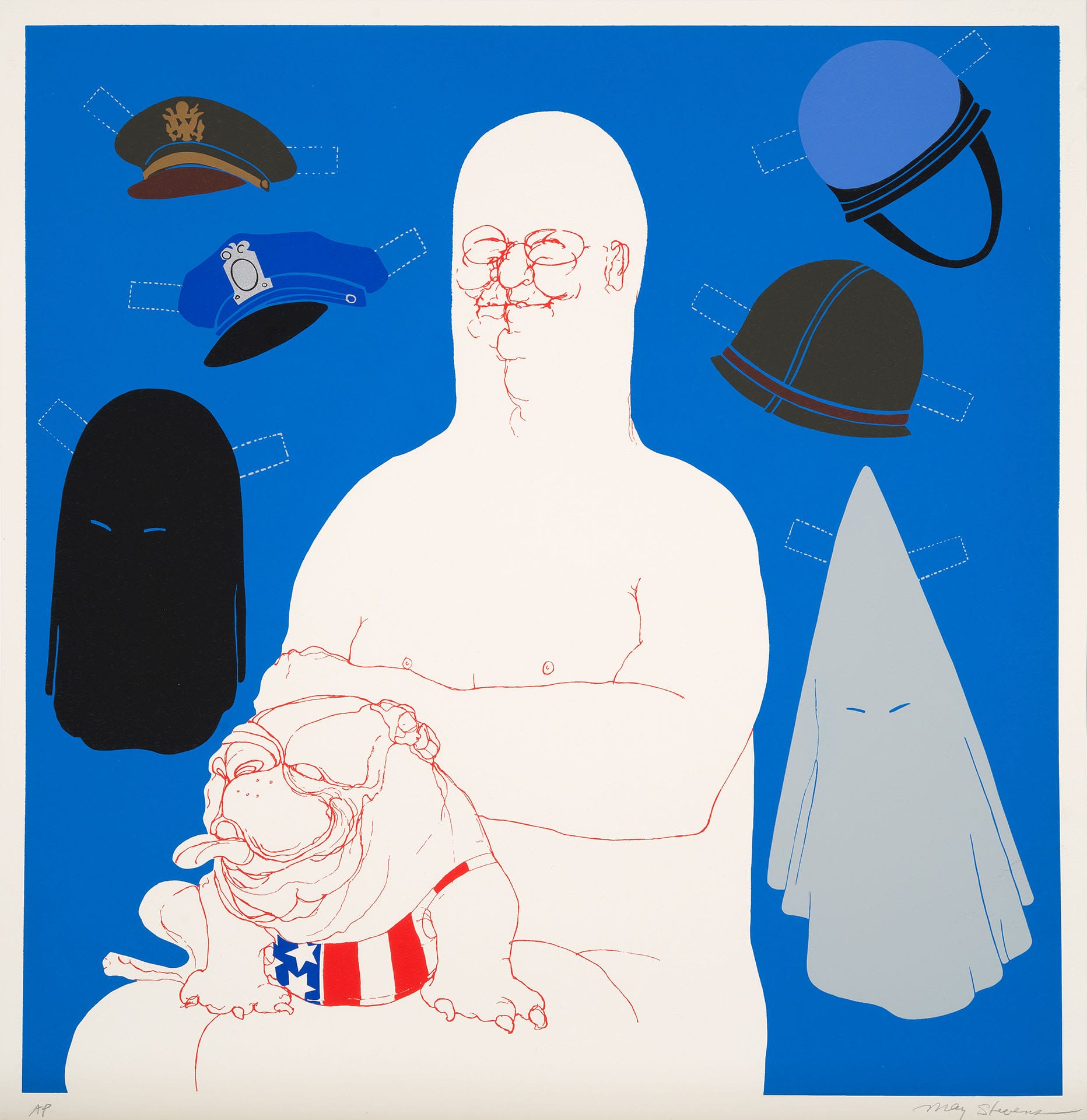 In the US, artists responded to the developing Civil Rights, feminist, and other social movements with Pop. In Barbara Jones-Hogu’s screen prints “Nation Time” (1970) and “Land Where My Father Died” (1968), the US flag is reconfigured into swirling and brick-like designs that fly over Black demonstrators who march and raise their fists. May Stevens’s screen print “Big Daddy with Hats” (1971) stemmed from her opposition to the Vietnam War and to the authoritarianism and racism of her father’s generation. Both artists’ arguments for racial justice in civil life and policing continue to be urgent today. But as the exhibition shows, Pop is an artistic language that spans borders and time.