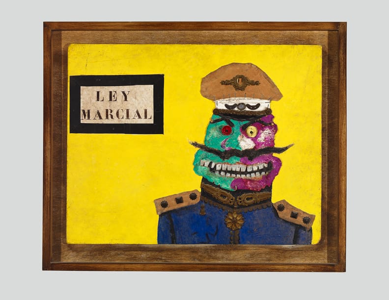 For those under violent regimes, Pop offered a less obvious means of leveling critique. Antonio Berni’s collage painting “Ley marcial o le dictateur (Martial Law or The Dictator)” (1964) was created amid a string of Argentine military dictatorships. In the piece, a mustachioed military man made from bits of plastic, tap shoe tips, cardboard, and other throwaways appears inside a TV-like frame beside a boxed text reading “LEY MARCIAL,” or “MARTIAL LAW,” as if he’s announcing the policy on a news broadcast. The figure’s junk materials and cartoonish face suggest that military leaders like this one are, in themselves, useless hunks of trash.