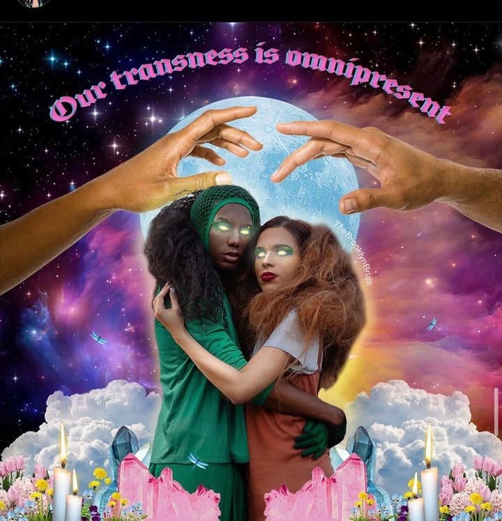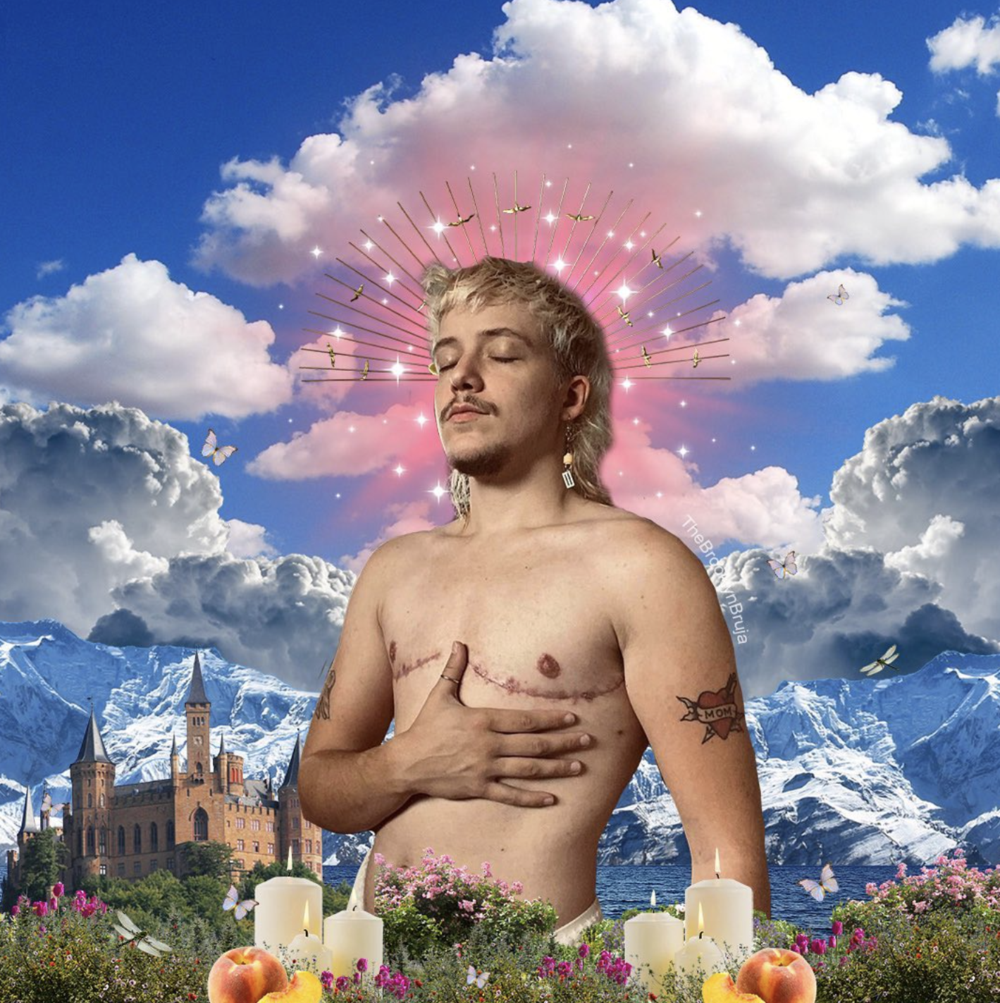 Surrounded by tulips and lilacs, a Black person with top surgery scars and a chest tattoo reading “Resurrected 01-26-2012” raises their face up to the sky. Titled “Created in Divine image” (2020), a phrase repeated in pink text against a background of gray clouds, that person’s hollow face is pierced by rays of pink, white, and blue light — the colors of the trans pride flag. In the Instagram caption accompanying his work, trans artist Río Edén wrote, “Blessed be those who live outside the binary, bless be those who challenge the binary, bless be those who are trans.”