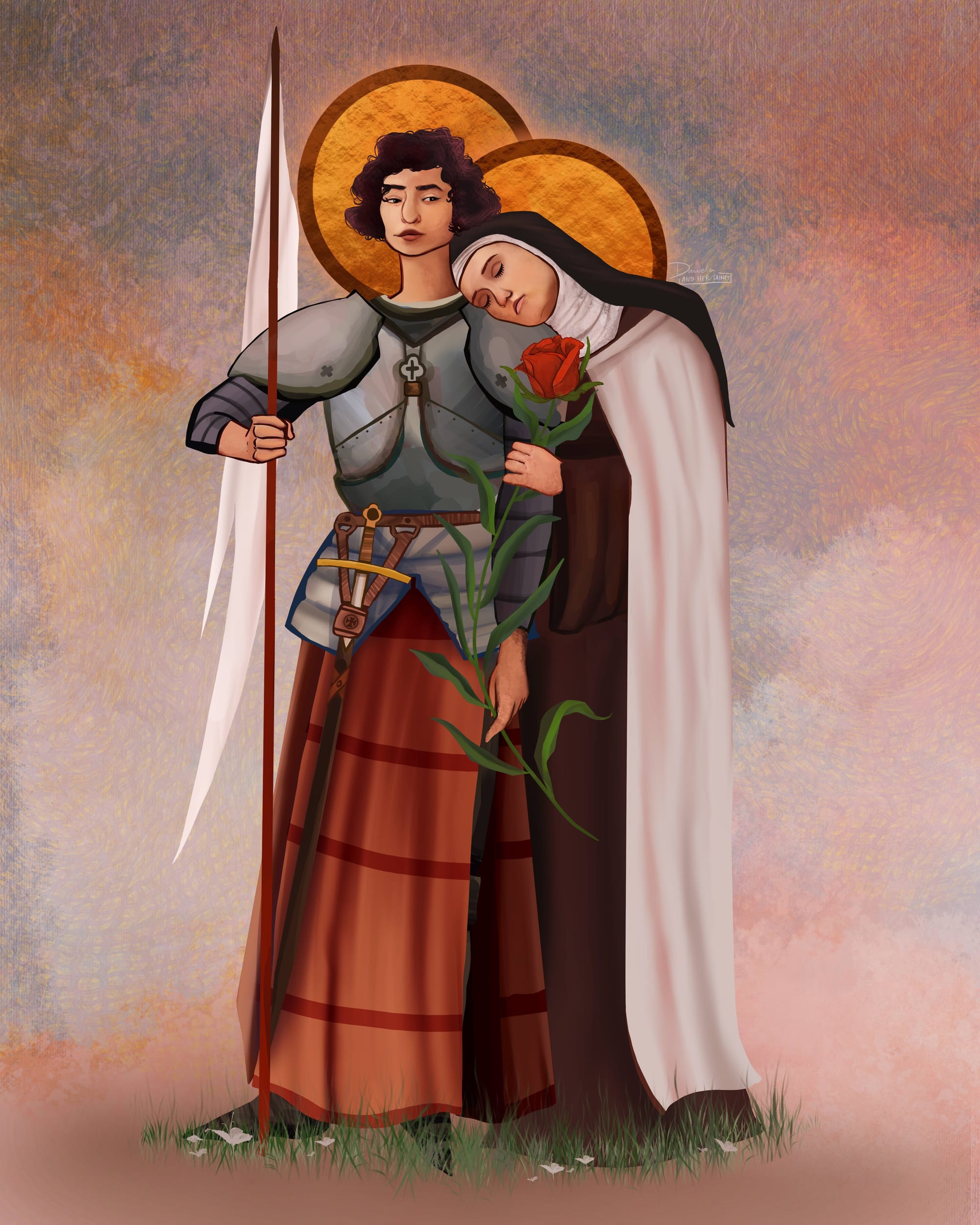 With seraphs bearing top surgery scars, Barnhill creates distinctly modern queer Catholic icons in bold defiance of the Church’s queerphobic stance. Similarly, queer femme artist Dani explores butchfemme identity in her portraits of Catholic saints through her Instagram account AndHerSaints. With intimate portraits of St. Therese of Lisieux and St. Joan of Arc, their works center on dignity: acknowledging that queer lives and experiences are sacred and holy.