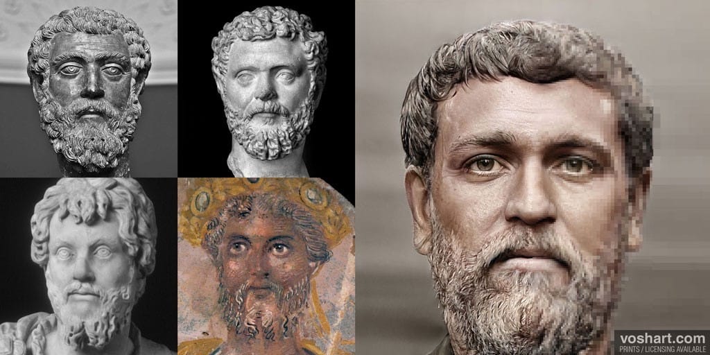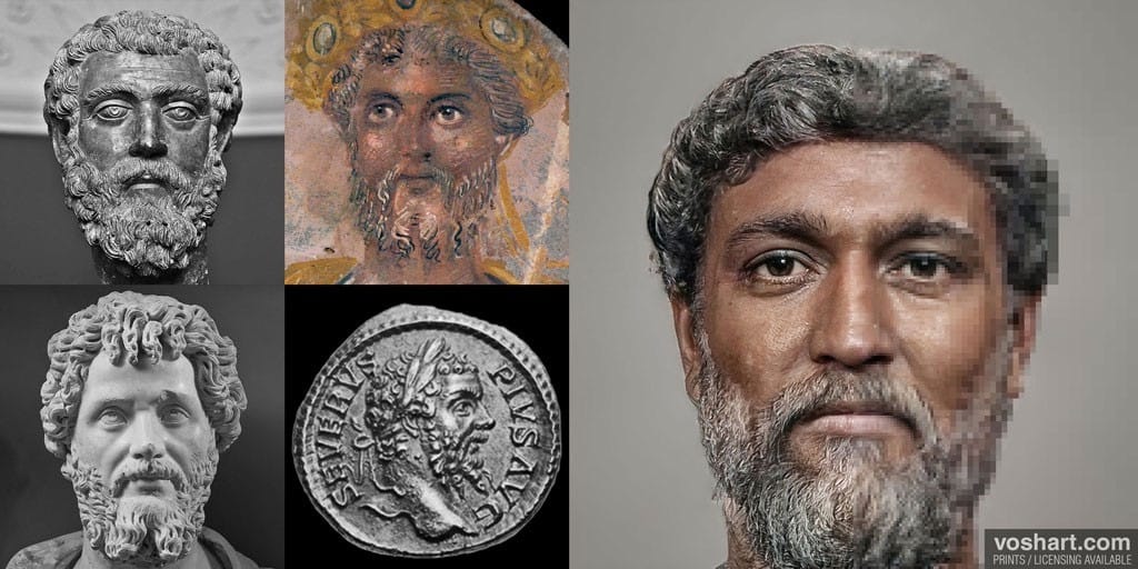 Due to the choices Voshart made, his work does not display the ethnic diversity of the ancient world. More importantly, it also only addresses the emperors of the Roman Empire rather than the general populace of the ancient Mediterranean. Certainly, one can grant some artistic license to such interpretations. Yet, while Voshart’s images include a range of hair texture, eye color, and skin color, none of the portraits initially included anyone with brown skin or tight curls. Especially given his choice of skin tones, Voshart has constructed predominantly portraits with lighter skin tones that do not reflect the multi-ethnic ancient Mediterranean world. The initial single exception is the darker skin tone of Voshart’s rendering of the emperor Septimius Severus.