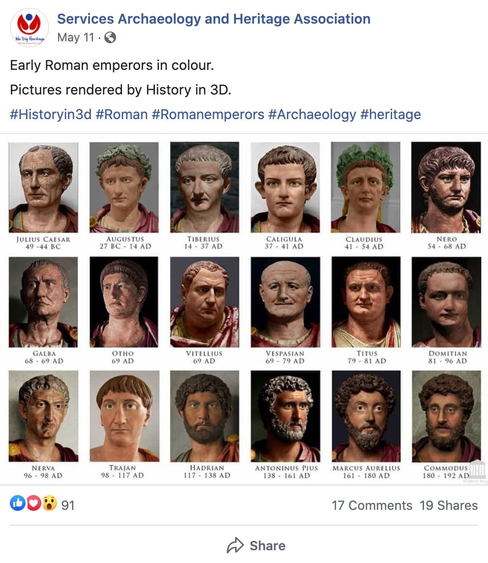 To be sure, Voshart’s Roman emperors may spur interest in ancient history, but it is important to emphasize that color reconstructions carry their own caveats. For instance, the new History in 3D project touts its own polychromatic reconstructions of white-appearing emperors and hashtags these reconstructions with #heritage. Comparing reconstructive differences would be useful in pedagogical environments. Allowing students to use the technology to construct images allows them to better understand the diversity of the ancient world as well as the limitations of such technology. However, not all users are aware that these portraits are only loosely based on textual and aesthetic sources, most often without any underlying paint on the bust to indicate the skin color of the original (and even paint on busts was but an idealized artistic choice). It is important for students and the public alike to recognize that even with the best available technology, no artist or scientist will be able to create a definitive, frozen portrait of a resident of the ancient Mediterranean. We will never know with 100% accuracy what someone actually looked like in the ancient world, no matter how realistic the generated portrait may appear.