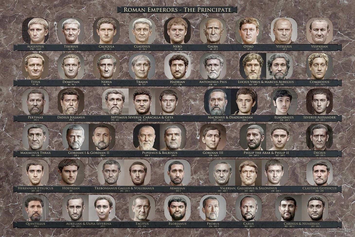 Taking base images of busts and then using Photoshop and Artbreeder, a machine learning, photo-mixing platform, Voshart generated what he calls “photoreal” images. In part, his project has gained attention as the white marble sculptures one typically sees have been transformed into stunningly life-like portraits imitating the original polychromy. For instance, Augustus is reconstructed with beige skin, gray eyes, and sandy blond hair. Each portrait is unique. In his Medium post, Voshart asserts that he used historical texts, coinage, and sculpture in crafting his images with attention to age, hair, eyes, and ethnicity. He also admits that his project involves artistic interpretation and that he crafts composite images when busts were not available. Voshart explains, “My goal was not to romanticize emperors or make them seem heroic.” Still, because these images are so seemingly realistic, they could easily be mistaken for accurate reconstructions, especially when neatly assembled as a poster and made available for purchase.