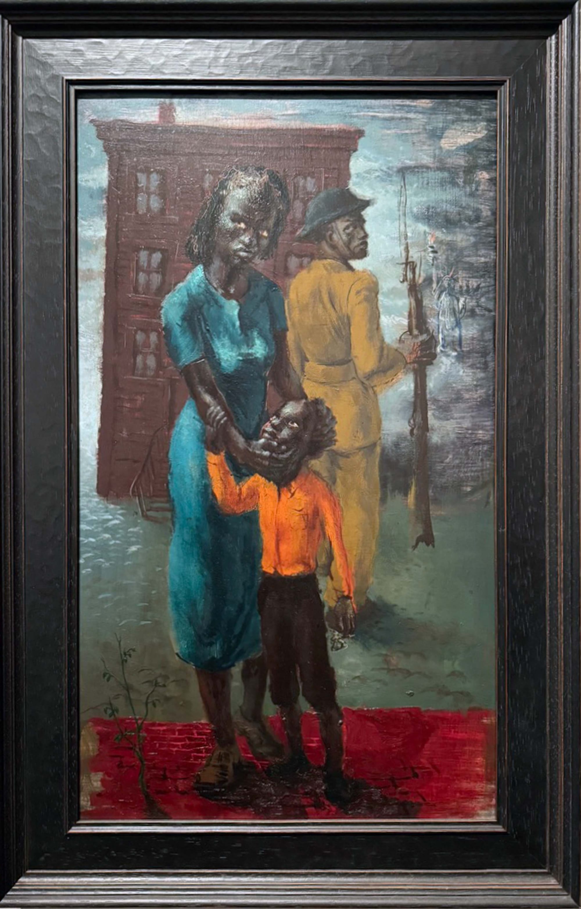 At the start of his career, Wright submitted poetry and journalism to leftist periodicals like the influential New Masses, where Wilson’s art would also feature. In 1945, the magazine reproduced “Deliver Us From Evil” (1943) a lithograph connecting the atrocities of WWII with the racial violence occurring in the United States. This work is one of a series developed in the 1940s, wherein war, too, is defined by the exploitation of the working and oppressed classes and has racial implications back home. This is personified in two oil paintings on Masonite: “Black Soldier” (1943), a striking family portrait in which the eyes of a mother, father, and son each tell a different story, and “Black Despair” (1945), a simple portrait of a soldier at the end of his rope, hunched over a table, face obscured by his arms, his fist clenched.