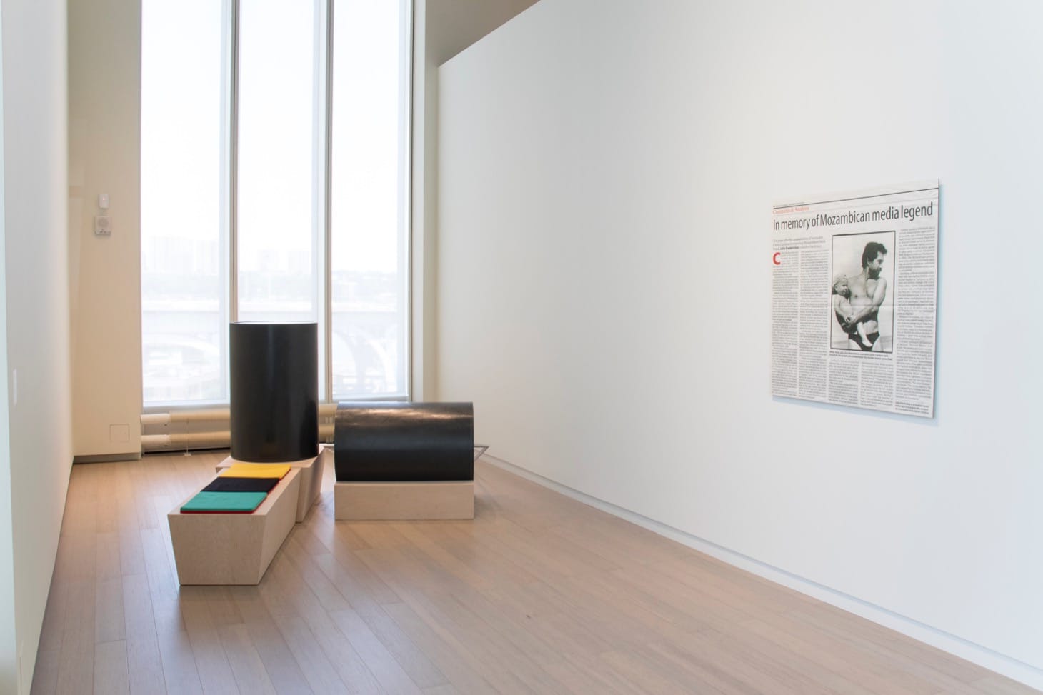 Angela Ferreira’s work also gives us a look at the end of socialism in Mozambique. Contrasting the utopic nature of “For Mozambique”, “MediaFax 2” (2011) is a monument to those, specifically the slain journalist Carlos Cardoso, who strove to reject state control over information and expose government corruption. The piece itself is meant to resemble a fax machine: Two, connected, black cylinders resting on wooden plinths vaguely resemble makeshift telephones, while vibrantly colored pillows lay on an adjacent plinth like printed pages waiting to be picked up or used. The form and title are both references to MediaFAX: a daily newspaper that was headed by the slain Mozambican journalist, Carlos Cardoso which was the first to disseminate information via fax as a means of escaping government control and evading geographic borders.