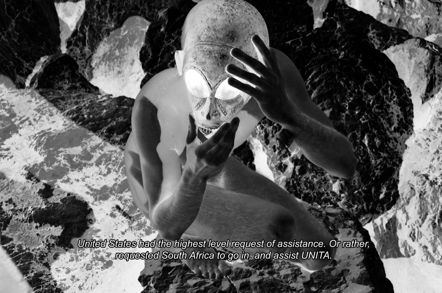 Angolan photographer, performer and multimedia artist, Kiluanji Kia Henda also engages with the ways that colonialism lingered in popular consciousness. With humor and irony, he challenges notions of identity, politics, and modernity that are at the center of socialism’s humanist aims. Central to “The Bad Guys and the Good Guys” (2010–2016) is a figure that at a glance looks extraterrestrial, but with time can be perceived to be holding a Chokwe mask. The narrative unfolds through various frames as the figure traverses deserted landscapes as text quotes from the CNN documentary series Cold War make legible the vested interests of various foreign agents in Angola’s civil war. Henda continues to play on expectations of narratives about African independence with “Spaceship Icarus 13” (2008) — a fictionalized retelling of a voyage to space which never took place. In reframing an empty movie theatre as a space center and laborers as astronauts, Henda presents an alternate future by reimagining the past.