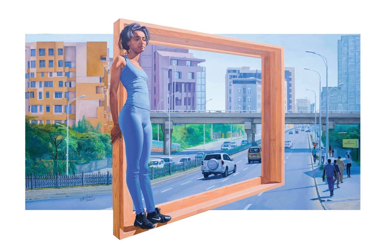 Demonstrating a high level of proficiency, Mezgebu Tesema similarly demonstrates his interest in expanding traditional forms to reveal new meanings. In the trompe l’oeil painting “Standing on the Frame” (2015), a young woman leans against the edge of a wooden frame — a frame that juts out, levitating on its own plane which seamlessly intersects but is not a part of the large Addis Abba landscape which acts as her backdrop. The figure’s precarious position speaks to the uncertainty produced around people’s identities in the aftermath of social upheaval.