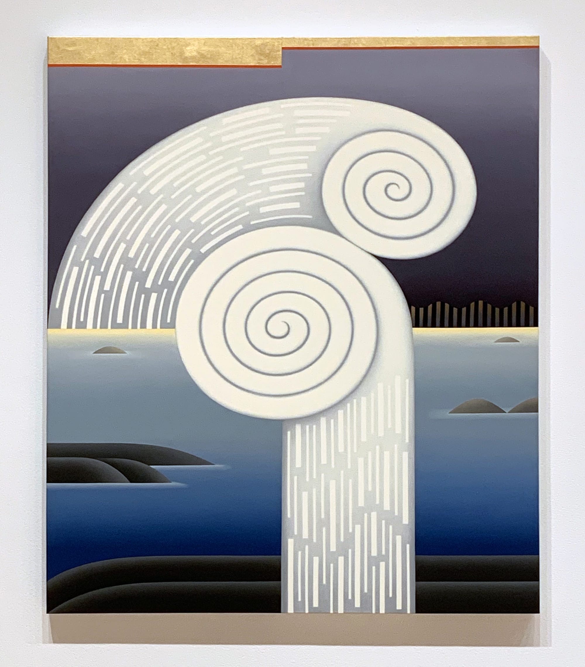 Yamaguchi’s image lexicon also includes architectural columns, fountains, and geometric patterns derived from historical Japanese art, as in Ukiyo-e prints or folding screens. The latter influence is particularly evident in “Trap” (2024), where swirling cloud formations inhabit the sky and rhythmic waves swirl in the center like the codependent halves of a yin-yang symbol. A similar effect is at play in "Accomplice” (2025), where two Greek columns have been whimsically anthropomorphized such that they appear to be snuggling.