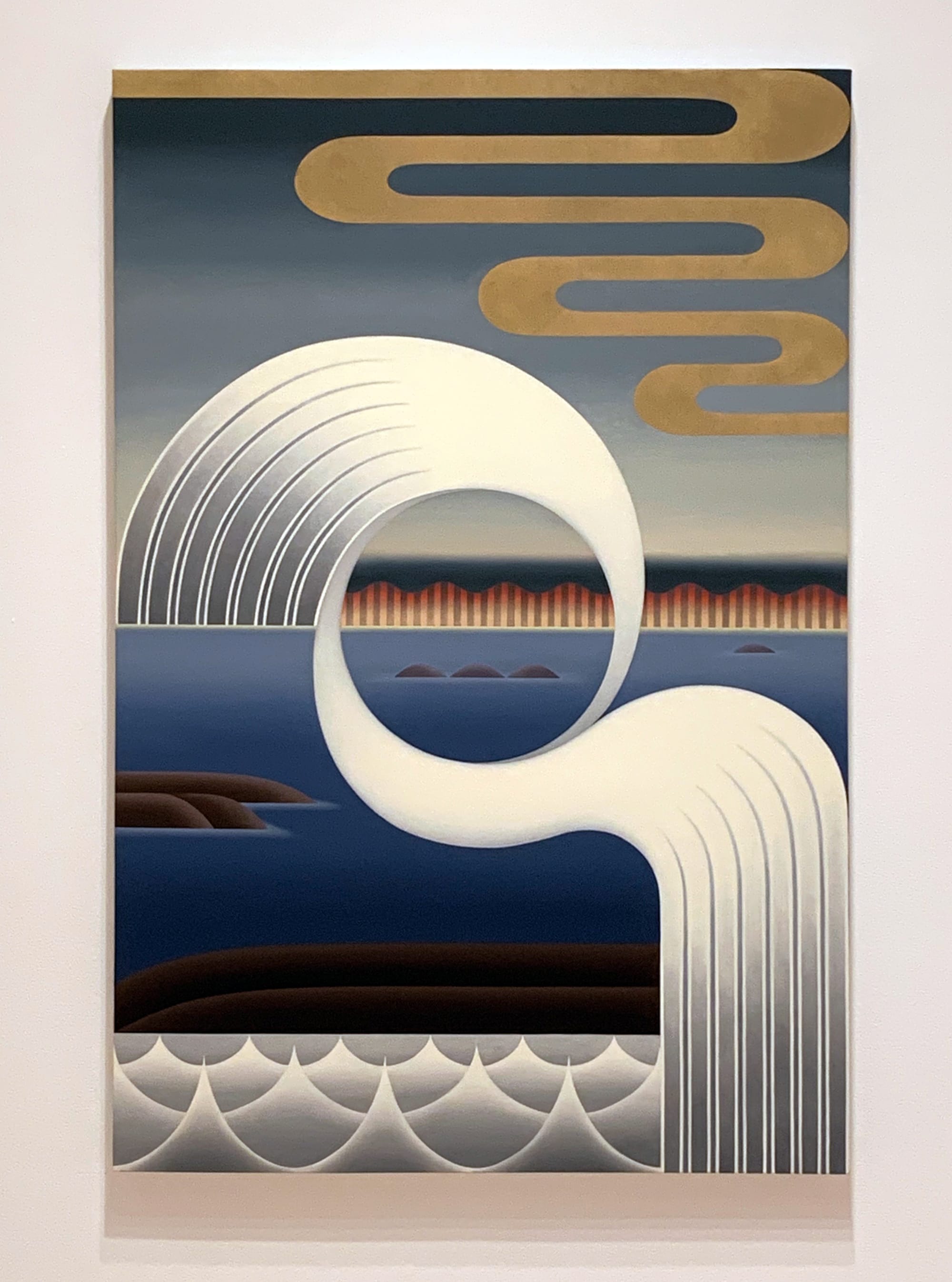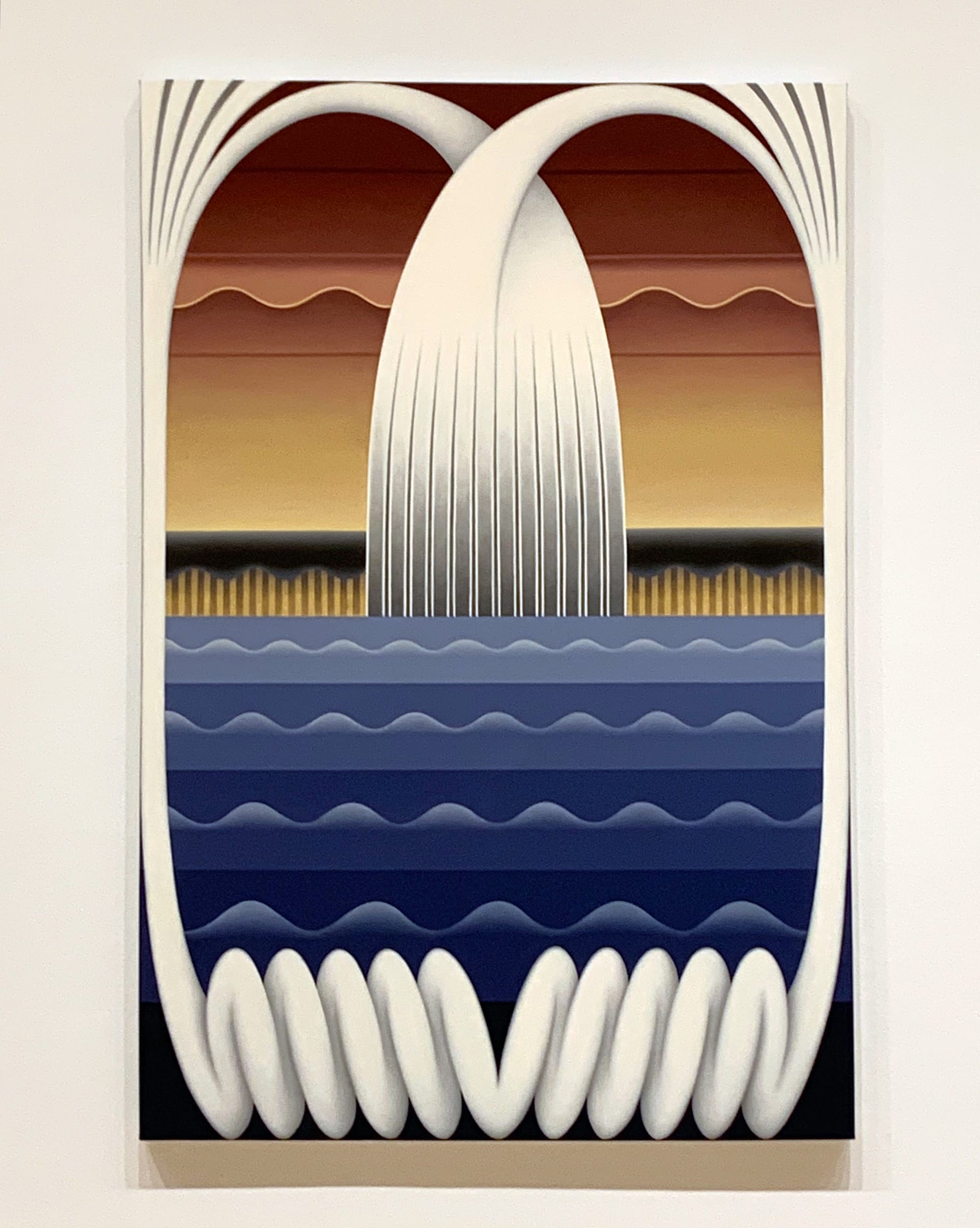 What makes a seascape? In this focus exhibition of 10 recent paintings at the Museum of Contemporary Art, veteran Los Angeles artist Takako Yamaguchi subverts the traditional notion. Rather than base her imagery on observations of the natural world, she takes the opposite approach and practices what she calls “abstraction in reverse.” Recognizing that early European and American Modernists derived their geometric or organic forms from nature, she instead begins by using abstract shapes to construct calm seascapes, with horizon lines bisecting each composition into two equal sections. She superimposes additional abstract imagery reflecting her love of pattern and decoration, fashion, and her concept of beauty, some loaded with symbolic associations.