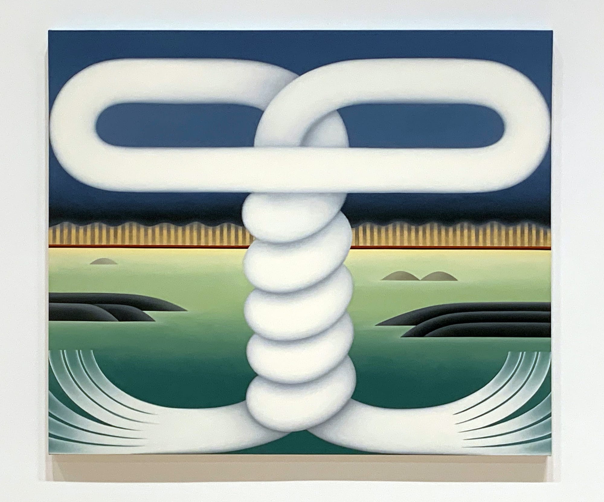 In “Stitch” (2023), a brown rectangle suggests the presence of a beachfront, the ocean is divided into horizontal registers made up of undulating lines and interlocking zigzags, and clouds have been replaced by an expansive braid that the walls points out recalls a close-up of those feminized materials of hair or fabric. Easily perceived as separate elements, Yamaguchi’s abstract and figurative configurations do not really interact. Rather, they peacefully coexist as two worlds in one, as nature and culture.
