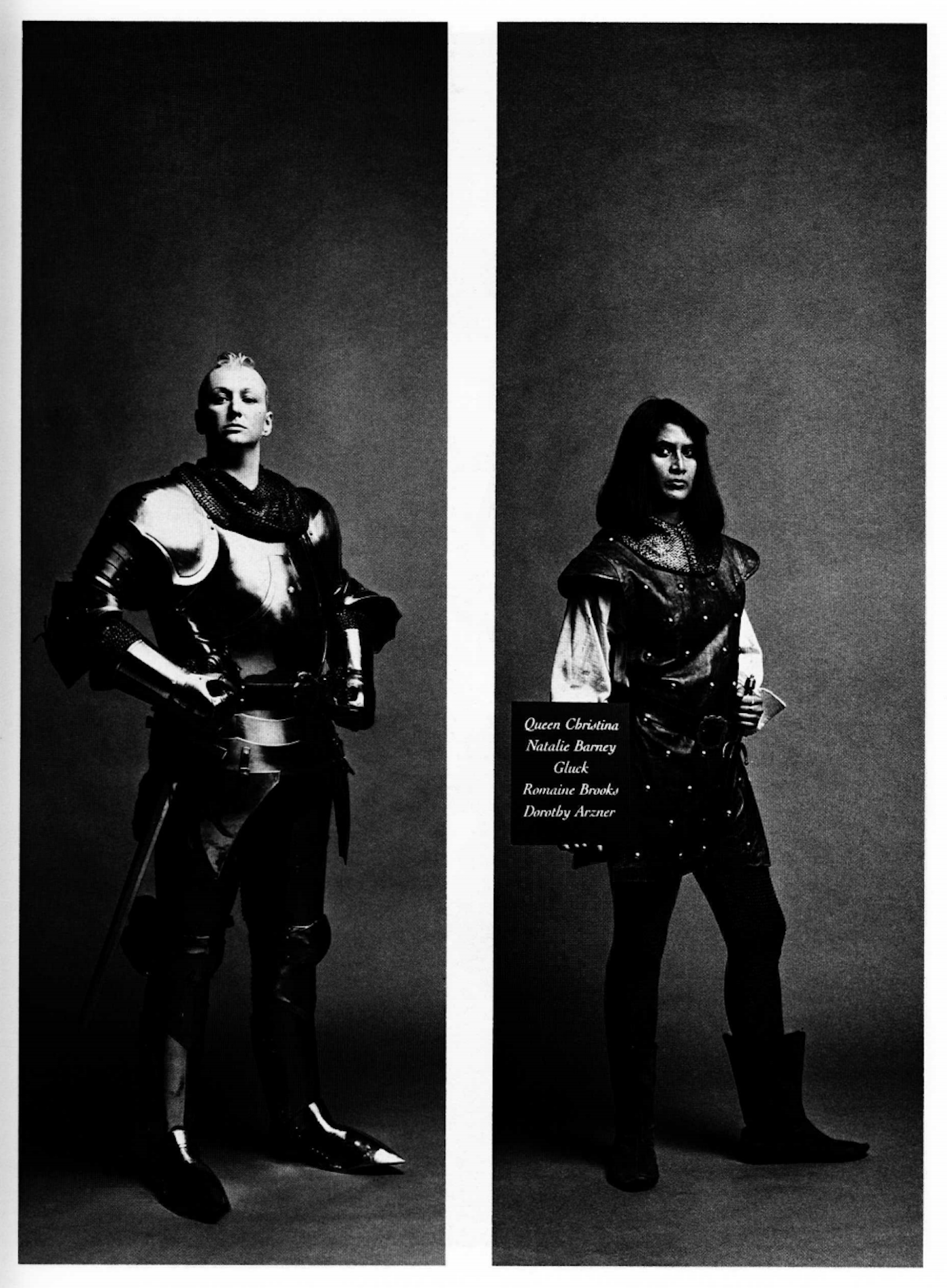 Nowhere is Boffin’s commitment to lesbian genealogies more palpable than in her series The Knight’s Move (1990), which she created for Stolen Glances: Lesbians Take Photographs (1991), a book and exhibition project with Jean Fraser that serves as an invaluable but tragically overlooked contribution to lesbian visual history and the history of photography at large.  In the essay that prefaces the photographs, Boffin expresses frustration around the constant prioritization of reality above fantasy. She voices her belief that the lesbian community needs to create its own role models, even if they are only imaginary. “The burdens imposed by this scarcity of representation,” Boffin writes, “can be overcome if we go beyond our impoverished archives to create new icons.” She included this poem-like text with the photograph series:
