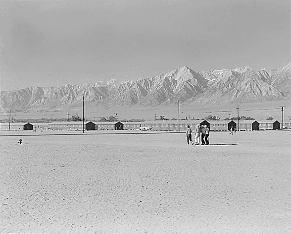 In 1942, the US Army opened Manzanar camp in the desert of east-central California, at the foot of the Sierra Nevada mountains, on land that they leased from the city of Los Angeles. Named after the agricultural settlement that was effectively quashed when the city’s mighty Department of Water and Power finished acquiring the area’s water and land rights, Manzanar had already been the site of the forced relocation 80 years before when the Owens Valley Paiute, the Native Americans who had been there for 1,400 years, were displaced.