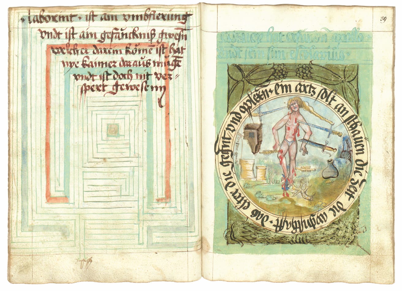 The Wound Man, he argues, was not “originally designed to inspire fear or to menace.” Instead, early versions of the Wound Man accompanied by summaries of medical treatments likely offered reassurance to patients coping with ailments of their own. “Although at first appearing to be a pained and pitiless figure, one whose injuries threatened to overwhelm both their victim and the viewer,” Hartnell writes, “the Wound Man was in fact one of the period’s most sophisticated repositories of medical hope, at once enunciating and embodying the many cures he marshaled for the fifteenth-century reader.”