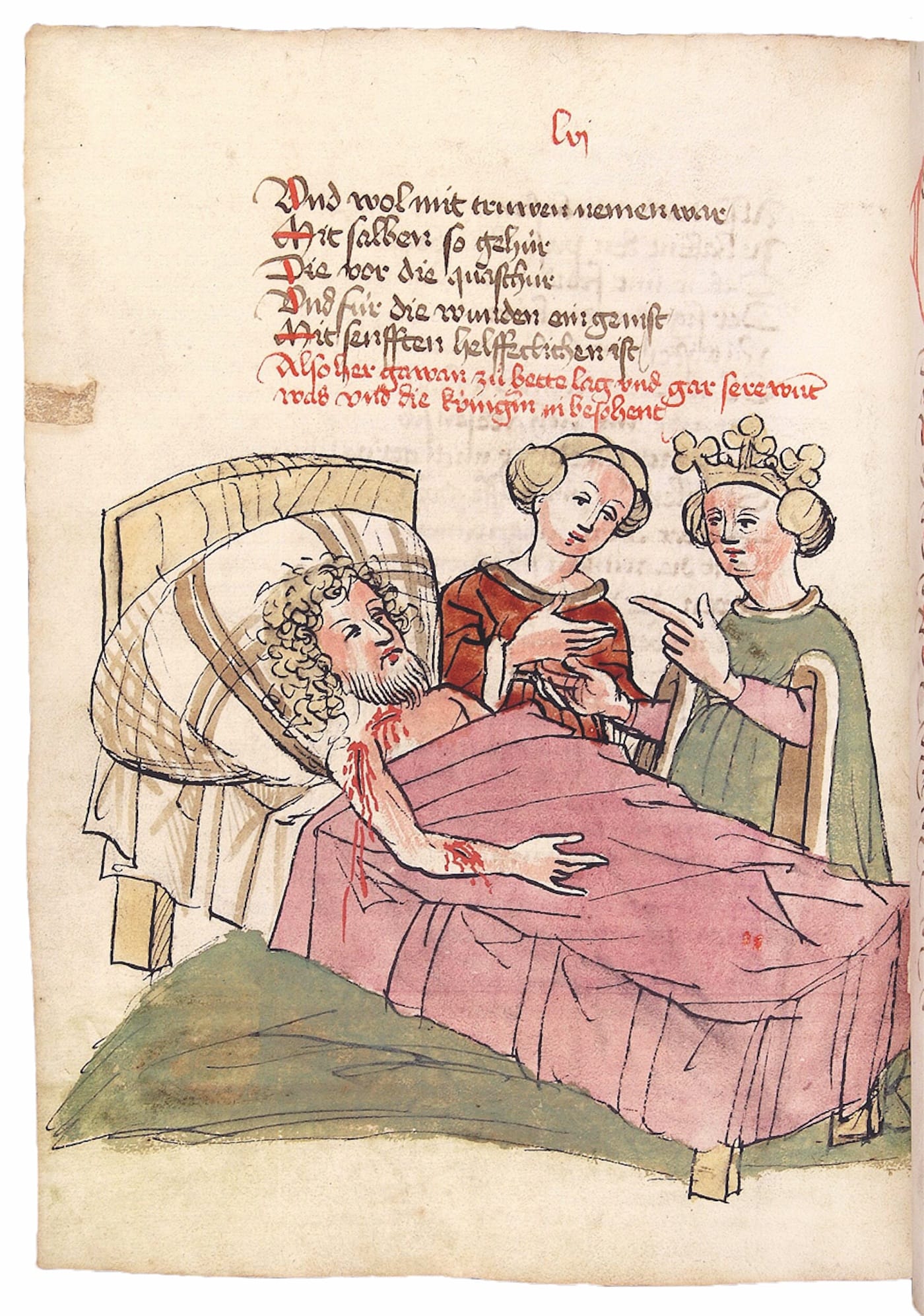 In the third and most satisfying chapter, Hartnell attempts to unpack the layered associations Medieval German viewers would have brought to bear on the image. The Wound Man’s dramatic injuries, he writes, may have conjured those of heroes in popular epic poems, such as Vivianz in Willehalm, Alderot in Der Sticker’s Karl Der Gross, and Siegfried in the Nibelungenlied (who are often getting stabbed, speared, and split in two). The tales of those gallant characters may have provided a notional backstory for the Wound Man, what Hartnell calls “the beginnings of a chivalric personhood.” Viewers could imagine him as a knight errant or, when military biographies emerged in the mid-15th century, they may have identified him as a veteran soldier.